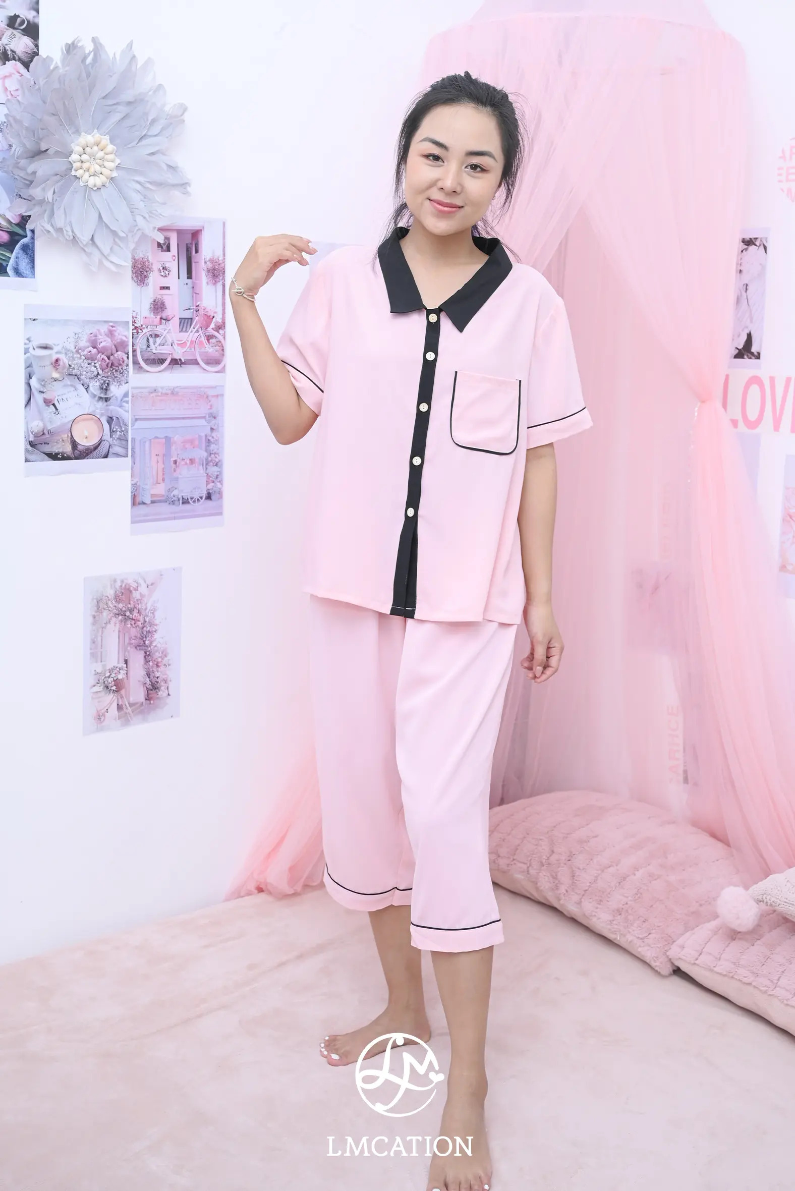 Quần lửng mặc nhà LMcation Alia mềm mại, sang trọng, được may từ chất liệu lụa cao cấp. Quần dài qua đầu gối, có túi hai bên tiện lợi và đính nơ xinh xắn, hoàn