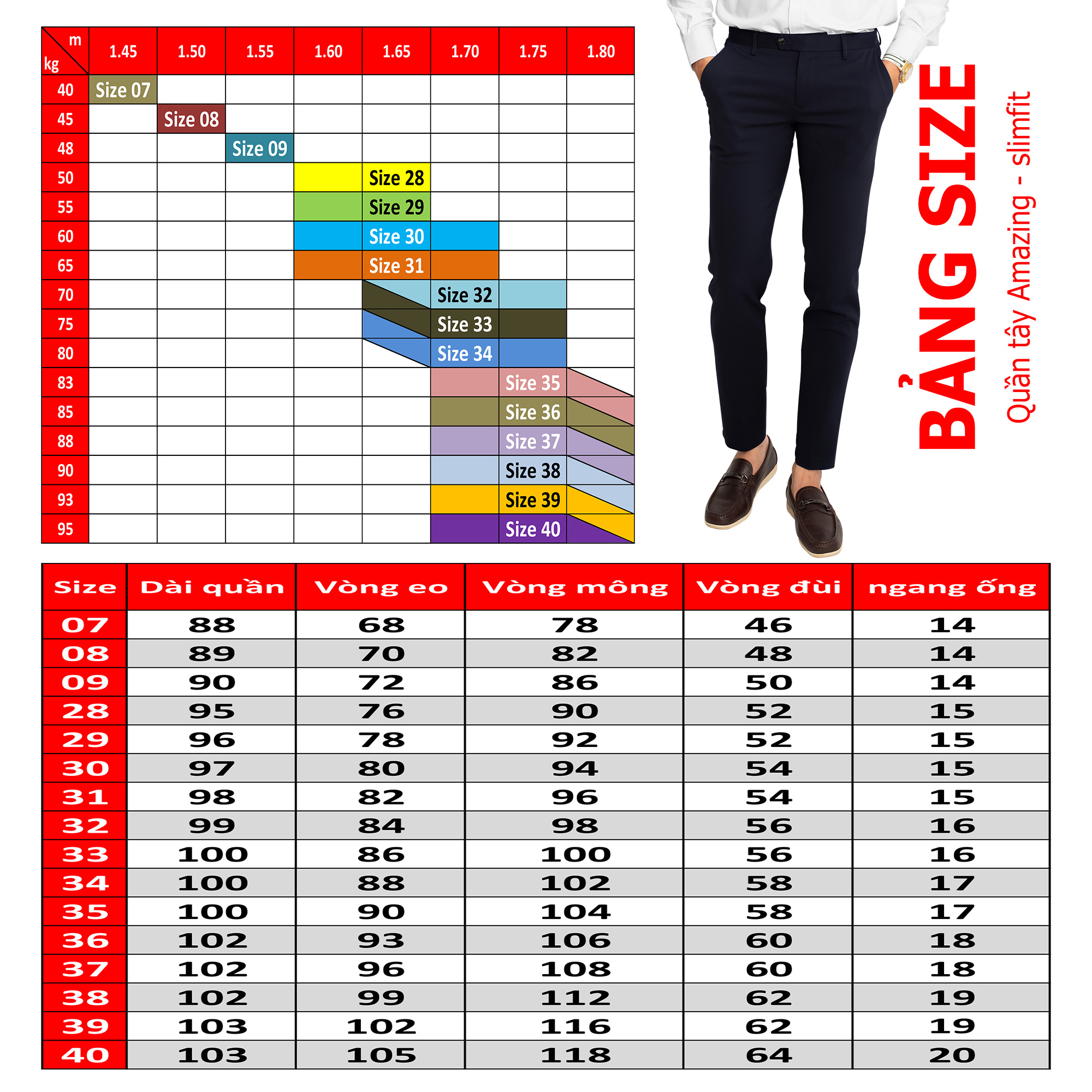- Cách chọn size quần tây âu Amazing form slimfit: Chỉ số cân nặng dưới đây chỉ mang tính tham khảo, để bạn biết cái khoảng size phù hợp với mình. Các chỉ số trong bảng thông số không tuyệt đối chính xác 100% bạn nhé ! Size Cân Vòng Vòng Dài nặng (kg) eo (cm) mông (cm) quần (cm) 7 35-40 68 78 88 8 40-45 70 82 89 9 45-50 72 86 90 ... 28 45-50 76 90 95 29 50-55 78 92 96 30 55-60 80 94 97 31 60-65 82 96 98 32 65-70 84 98 99 33 70-75 86 100 100 34 75-80 88 102 100 35 80-85 90 104 100 36 85-90 93 106 102 37 90-95 96 108 102 38 95-100 99 112 102