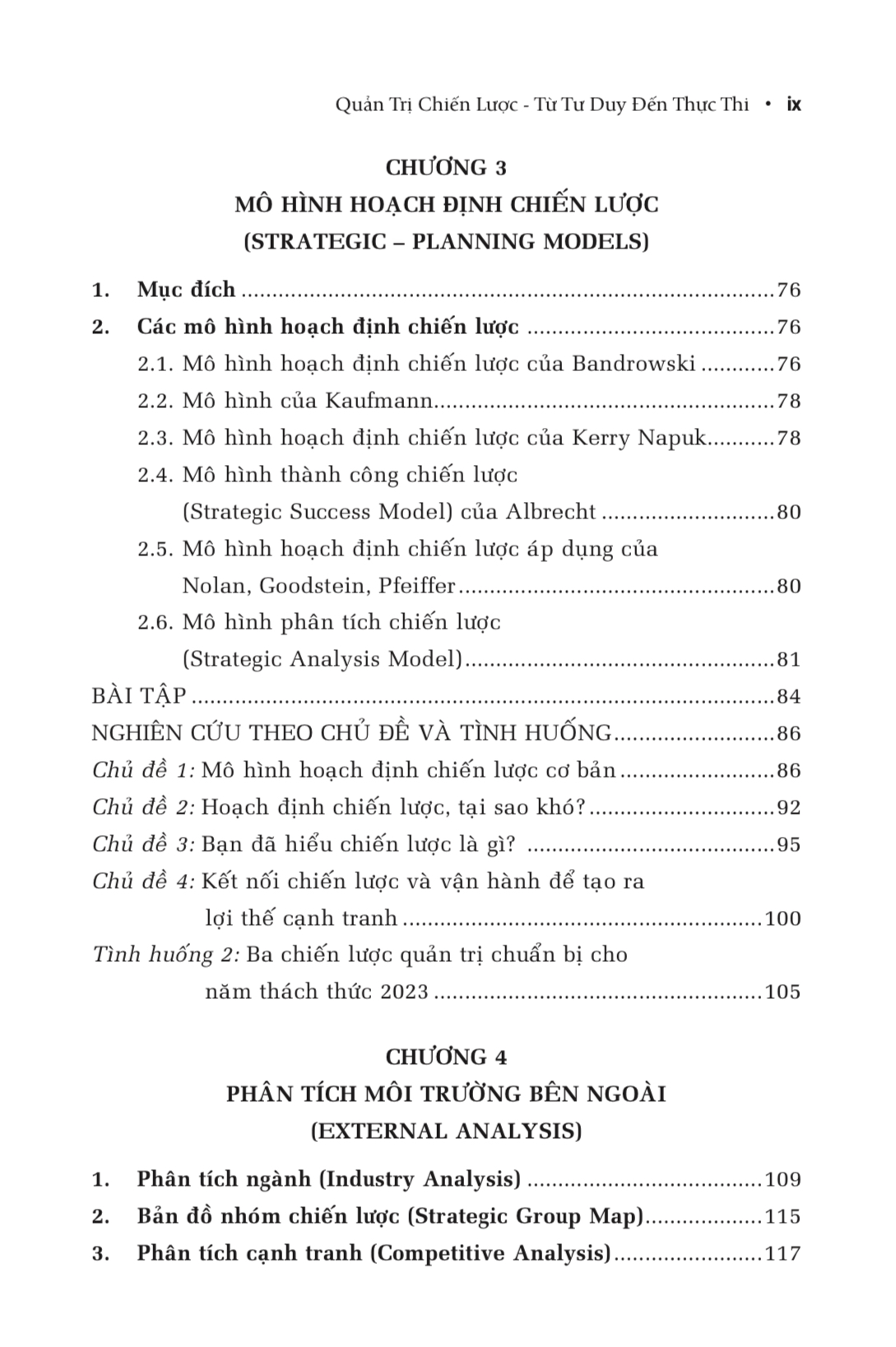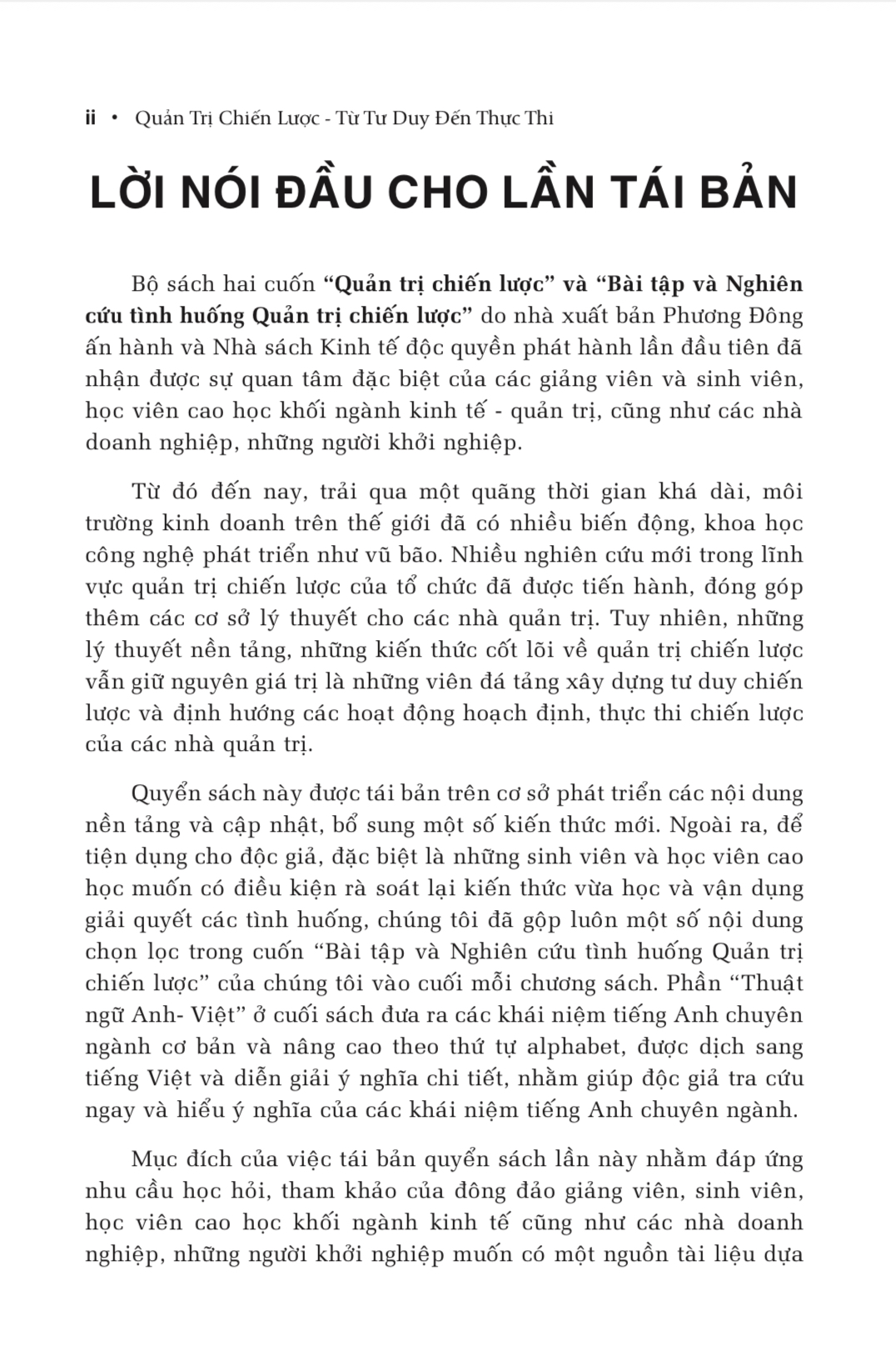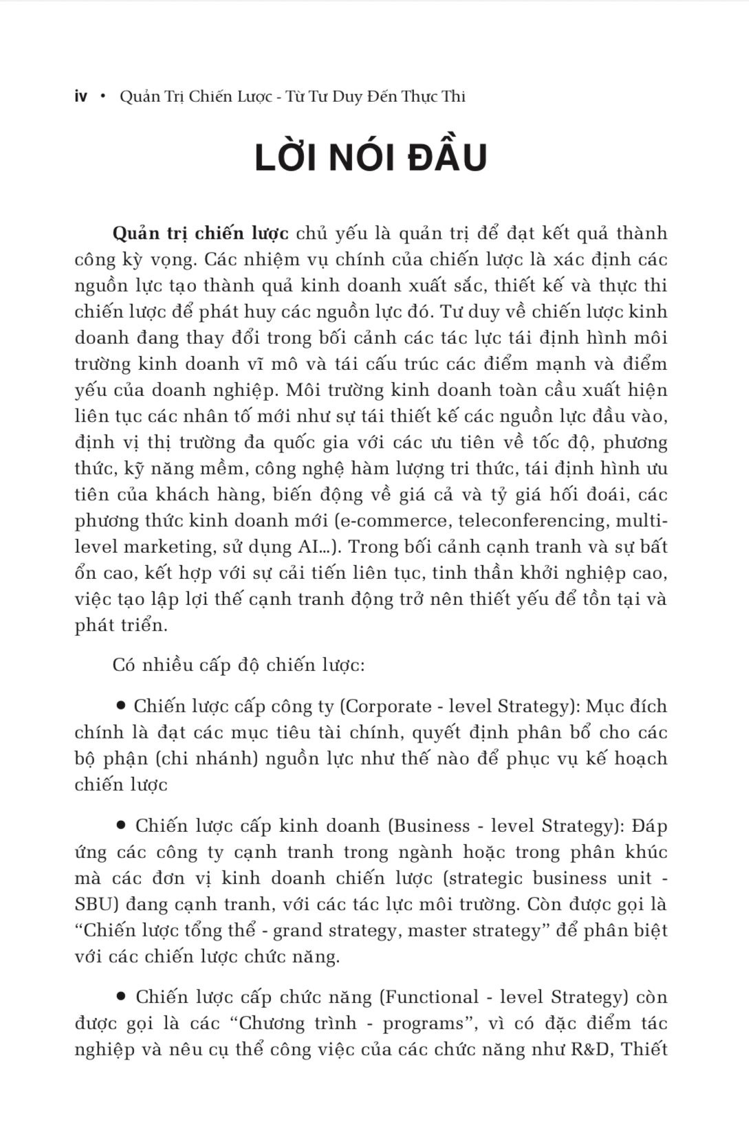 Quản trị chiến lược chủ yếu là quản trị để đạt kết quả thành công kỳ vọng. Các nhiệm vụ chính của chiến lược là xác định các nguồn lực tạo thành quả kinh doanh xuất sắc, thiết kế và thực thi chiến lược để phát huy các nguồn lực đó. Tư duy về chiến lược kinh doanh đang thay đổi trong bối cảnh các tác lực tái định hình môi trường kinh doanh vĩ mô và tái cấu trúc các điểm mạnh và điểm yếu của doanh nghiệp. Môi trường kinh doanh toàn cầu xuất hiện liên tục các nhân tố mới như sự tái thiết kế các nguồn lực đầu vào, định vị thị trường đa quốc gia với các ưu tiên về tốc độ, phương thức, kỹ năng mềm, công nghệ hàm lượng tri thức, tái định hình ưu tiên của khách hàng, biến động về giá cả và tỷ giá hối đoái, các phương thức kinh doanh mới (e-commerce, teleconferencing, multi-level marketing, sử dụng Al...). Trong bối cảnh cạnh tranh và sự bất ổn cao, kết hợp với sự cải tiến liên tục, tinh thần khởi nghiệp cao, việc tạo lập lợi thế cạnh tranh động trở nên thiết yếu để tồn tại và phát triển. Có nhiều cấp độ chiến lược: • Chiến lược cấp công ty (Corporate - level Strategy): Mục đích chính là đạt các mục tiêu tài chính, quyết định phân bố cho các bộ phận (chi nhánh) nguồn lực như thế nào để phục vụ kế hoạch chiến lược • Chiến lược cấp kinh doanh (Business - level Strategy): Đáp ứng các công ty cạnh tranh trong ngành hoặc trong phân khúc mà các đơn vị kinh doanh chiến lược (strategic business unit - SBU) đang cạnh tranh, với các tác lực môi trường. Còn được gọi là "Chiến lược tổng thể - grand strategy, master strategy" để phân biệt với các chiến lược chức năng. • Chiến lược cấp chức năng (Functional - level Strategy) còn được gọi là các "Chương trình - programs", vì có đặc điểm tác nghiệp và nêu cụ thể công việc của các chức năng như R&D, Thiết kế, Sản xuất, Tài chính, Marketing, Nguồn nhân lực... sẽ thực hiện trong năm. Quản trị chiến lược gồm các giai đoạn: • Phát sinh tư duy chiến lược. • Phân tích chiến lược. • Quá trình hoạch định chiến lược: Các mục tiêu, tầm nhìn, chiến lược, mục tiêu, phát biểu giá trị, mô hình kinh doanh... • Hoạch định tác nghiệp: Gồm các kế hoạch, ngân sách, nhiệm vụ chi tiết của các đơn vị. • Thực thi chiến lược: Sự tham gia cam kết của toàn bộ các cấp quản trị và nhân viên. • Đánh giá và kiểm soát: Duy trì tổ chức theo đúng tuyến chiến lược, phát biểu giá trị, mô hình kinh doanh có thể điều chỉnh tùy theo tình huống. Quyển sách "Quản trị Chiến lược" này gồm các chương quan trọng sau: Chương 1: Tổng quan về Quản trị chiến lược (Overview of Strategic Management) Chương 2: Cạnh tranh trong ngành (Industry Competition) Chương 3: Mô hình hoạch định hhiến lược (Strategic Planning Models) Chương 4: Phân tích môi trường bên ngoài (External Analysis) Chương 5: Phân tích công ty (Company Analysis) Chương 6: Hoạch định và lựa chọn phương án chiến lược (Strategic Planning and Strategic Alternative Choice) Chương 7: Thực thi chiến lược (Strategic Implementation) Chương 8: Kiếm soát chiến lược (Strategic Control) Quyển sách giới thiệu các khái niệm, kiến thức cơ bản và nâng cao, các mô hình, các kỹ thuật phân tích, hoạch định, thực thi, kiểm soát hiệu quả các chiến lược, làm nền tảng để tạo lợi thế cạnh tranh khác biệt, được kỳ vọng sẽ hữu ích với các sinh viên đại học, học viên cao học, các giảng viên, các nhà nghiên cứu, các nhà quản trị...