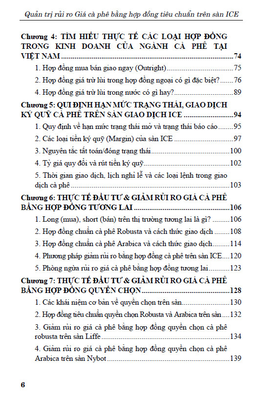 Ngoài ra, tác giả còn giới thiệu những công cụ bậc cao như cấu trúc các hợp đồng quyền chọn, quyền chọn chênh lệch giá, hợp đồng quyền chọn hàng tuần (weekly C coffee Option), hợp đồng tương lai giá cà phê theo giá thanh toán (Coffee TAS future)…để người đọc hình dung hết các sản phẩm tài chính ở nước ngoài đang hoạt động.