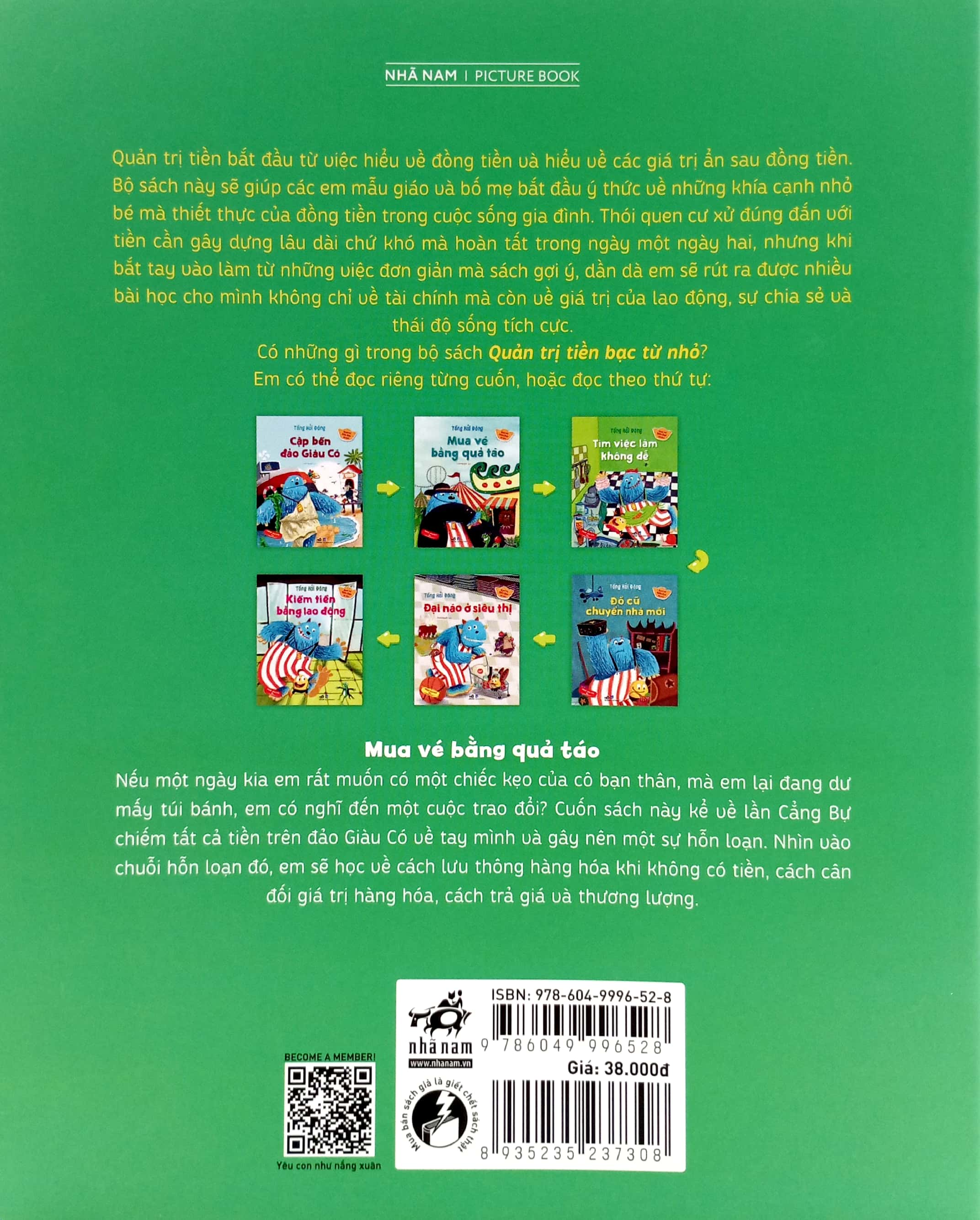 Quản Trị Tiền Bạc Từ Nhỏ - Mua Vé Bằng Quả Táo Giới thiệu tác phẩm Nếu một ngày kia em rất muốn có một chiếc kẹo của cô bạn thân, mà em lại đang dư mấy túi bánh, em có nghĩ đến một cuộc trao đổi? Cuốn sách này kể về lần Cẳng bự chiếm tất cả tiền trên đảo Giàu có về tay mình và gây nên một sự hỗn loạn. Nhìn vào chuỗi hỗn loạn đó, em sẽ học về cách lưu thông hàng hóa khi không có tiền, cách cân đối giá trị hàng hóa, cách trả giá và thương lượng.