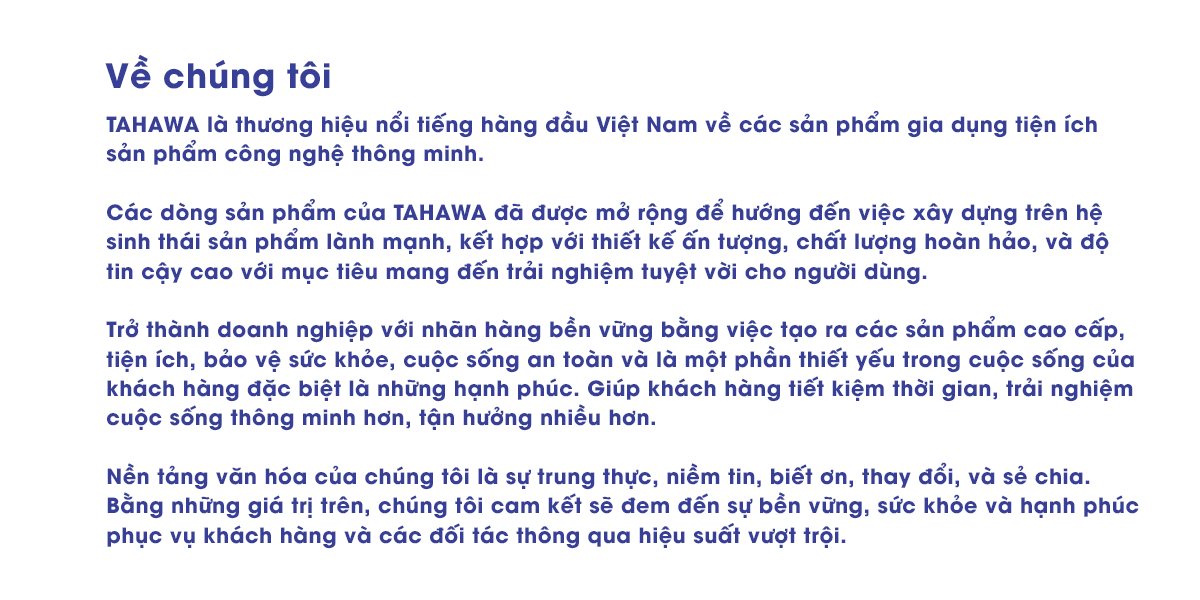 - Màn hình điều khiển trực quan cùng remote cầm tay tiện lợi Quạt không cánh Tahawa TH-A4 Pro sở hữu thiết kế hiện đại và an toàn Khác với những chiếc quạt truyền thống thông thường, Quạt không cánh Tahawa TH-A4 Pro sở hữu thiết kế độc đáo mang phong cách hiện đại, thiết kế không cánh bắt mắt tạo điểm nhấn cho không gian. Với kiểu dáng trụ đứng nhỏ gọn đơn giản, tiết kiệm không gian nhưng lại vô cùng sang trọng. Hơn nữa, thiết kế hoàn toàn không cánh của quạt có thể chạm bất cứ vị trí nào trên máy đảm bảo độ an toàn cho trẻ nhỏ và gia đình bạn. Quạt điện không cánh Tahawa TH-A4 Pro gồm 2 bộ phận chính là đế quạt và vành khuyên: • Đế quạt: gồm động cơ làm mát hình sóng sin 360 độ có chứa cánh quạt, được bố trí ở bên trong đế quạt chứ không thiết kế ở bên ngoài như các loại quạt truyền thống khác. • Vành khuyên: Khu vực tỏa ra luồng gió được thiết kế dưới dạng bầu dục. Thiết kế ống gió độc đáo cùng với sự kết hợp của công nghệ ACM (Air Certification & Multiplication) và khả năng cung cấp tới 750L không khí mỗi giây, Quạt không cánh Tahawa TH-A4 Pro tạo luồng gió rộng, mềm mại và giống với gió tự nhiên. Từ đó mang đến cảm giác dễ chịu, thư thái hơn cho người dùng, hạn chế các triệu chứng khó chịu như nhức đầu hay mệt mỏi thường gặp khi sử dụng các loại quạt khác. Khả năng làm mát tốt nhờ công suất máy lớn Khoảng cách cấp gió của Quạt không cánh Tahawa TH-A4 Pro có thể lên đến 10m. Quạt cây không cánh có khả năng cấp gió và làm mát diện rộng cho không gian căn phòng khách khoảng 30m2 với hiệu suất làm mới không khí 25 lần/giờ. Đặc biệt, quạt có thể dùng chung khi bật điều hòa cho hơi lạnh lưu thông nhanh hơn, giúp nhiệt độ phòng được cân bằng và làm mát đồng đều cho cả ngôi nhà. Lọc không khí hiệu quả nhờ bộ lọc thế hệ mới Quạt không cánh Tahawa TH-A4 Pro tạo ion âm khử mùi, bộ lọc Hepa thanh lọc không khí, bộ lọc Carbon khử mùi, đèn UV diệt khuẩn giúp không khí trong lành, an toàn, hiệu quả. Không chỉ làm mát, tạo gió mềm mại, tự nhiên mà quạt không cánh Tahawa TH-A4 Pro còn có khả năng thanh lọc không khí vô cùng hiệu quả thông qua bộ lọc Hepa 13 lớp lọc hạt vật chất cùng với việc bổ sung ion âm trong không khí. Các ion âm giúp khử mùi, hút sạch khói, khí độc hại, kết hợp với 1 bộ lọc than hoạt tính và 1 bộ lọc HEPA giúp lọc mọi bụi mịn, bụi thô, lông thú cưng, vi khuẩn nấm hay một số loại chất gây dị ứng cho cơ thể. Từ đó cải thiện không khí trong phòng, mang đến sự trong lành, dễ chịu, góp phần bảo vệ sức khỏe cho người dùng. Bù ẩm bằng hơi nước hiệu quả Quạt Không Cánh Tahawa TH- A4 Pro có khả năng bù ẩm bằng hơi nước hiệu quả, rất thích hợp sử dụng trong điều kiện thời tiết hanh khô, hoặc làm mát không khí tức thì. Với khay nước có dung tích lên đến 2 lít giúp cùng hệ thống bơm điện tử giúp quạt làm mát tốt hơn mà không tốn nhiều nước. Ngoài ra, bạn có thể bỏ thêm đá, đá khô vào khay nước để quạt làm mát tốt hơn. Góc gió rộng tùy chỉnh được tới 120 độ Quạt Tahawa TH-A4 Pro có thể tùy chỉnh góc gió phù hợp với nhu cầu với 3 góc độ làm mát từ 50 độ, 80 độ và 120 độ, giúp người dùng tận hưởng bầu không khí dễ chịu nhất. Nhờ vậy, quạt không cánh Tahawa TH-A4 Pro có thể cung cấp gió cho mọi ngóc ngách trong không gian nhà từ phòng ngủ cho tới phòng khách hay phòng bếp. Động cơ không chổi than DC bền bỉ, độ ồn thấp Quạt không cánh Tahawa TH-A4 Pro sử dụng động cơ DC không chổi than mạnh mẽ cho lưu lượng gió có thể đạt đến 1100 lít/giây, đi kèm 12 cấp đô gió, cho khả năng tùy chỉnh tối ưu theo từng mục đích sử dụng của người dùng. Động cơ DC được thiết kế theo dạng hình sóng sin 360°, kết hợp với bộ giảm âm hai lớp, giúp máy hoạt động êm ái với tiếng ồn thấp chỉ 14.8dB, tạo sự thoải mái cho người dùng nhất là khi sử dụng quạt trong phòng ngủ. Màn hình điều khiển trực quan cùng remote cầm tay tiện lợi Phía trước Quạt không cánh Tahawa TH-A4 Pro được trang bị màn hình điều khiển rõ nét với các thông số hiển thị trực quan, từ đó giúp người dùng có thể dễ dàng quan sát và quản lý thiết bị một cách thuận tiện nhất. Bên cạnh đó, nhà sản xuất còn trang bị một chiếc remote điều khiển từ xa với độ nhạy được nâng cao, có khả năng đồng bộ với quạt trong thời gian thực, người dùng dễ dàng thao tác điều hướng quạt không cánh Tahawa TH-A4 Pro với mọi vị trí khác nhau trong nhà. Ngoài ra, với chế độ giảm độ sáng để màn hình không bị chói vào ban đêm, hay tính năng hẹn giờ tắt trong vòng 0-12 giờ, Tahawa TH-A4 Pro mang lại trải nghiệm hiện đại chưa từng có cho người dùng. Chính sách bảo hành Bảo hành chính hãng 2 năm 1 đổi 1 trọng 30 ngày Bảo trì trọn đời