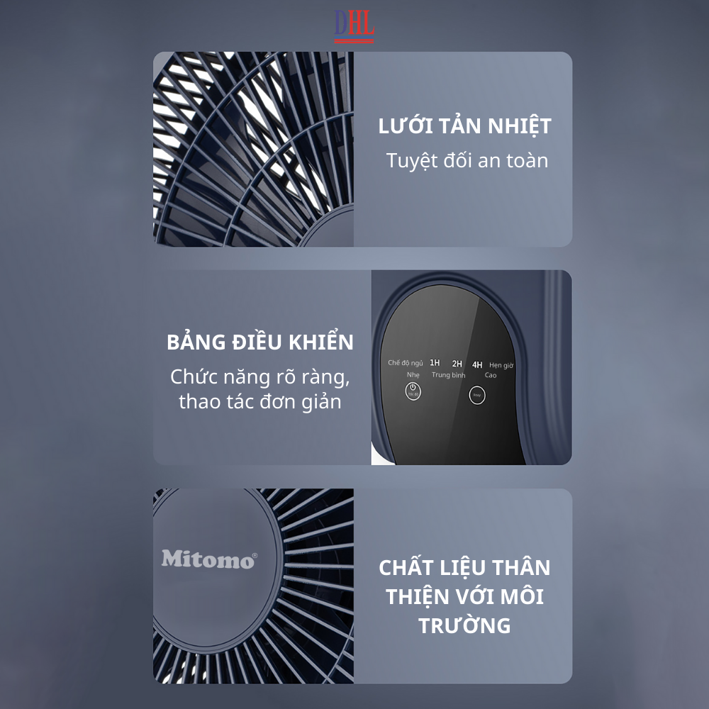 Mua tại TiktokQuạt treo tường Mitomo được thiết kế đơn giản, hiện đại với tông màu trắng và màu xanh than chủ đạo. Thân quạt và lòng quạt làm từ nhưa ABS cao cấp, mang lại vẻ sang trọng và chắc chắn. Quạt có điều khiển từ xa, tích hợp chức năng hẹn giờ thông minh. Ba cấp độ gió cùng tính năng xoay đa hướng giúp gió phủ rộng và đều hơn. Điểm đặc biệt của chiếc quạt Mitomo FTT-60HE đó là sử dụng bạn đạn nên có độ ồn cực thấp, nên rất thích hợp dùng cho phòng ngủ và những người nhạy cảm với tiếng ồn. Quạt dùng động cơ AC nên cực kỳ bên và tiết kiệm điện năng. Tính năng nổi bật của quạt treo tường đa năng Mitomo FTT - 60HE chính hãng