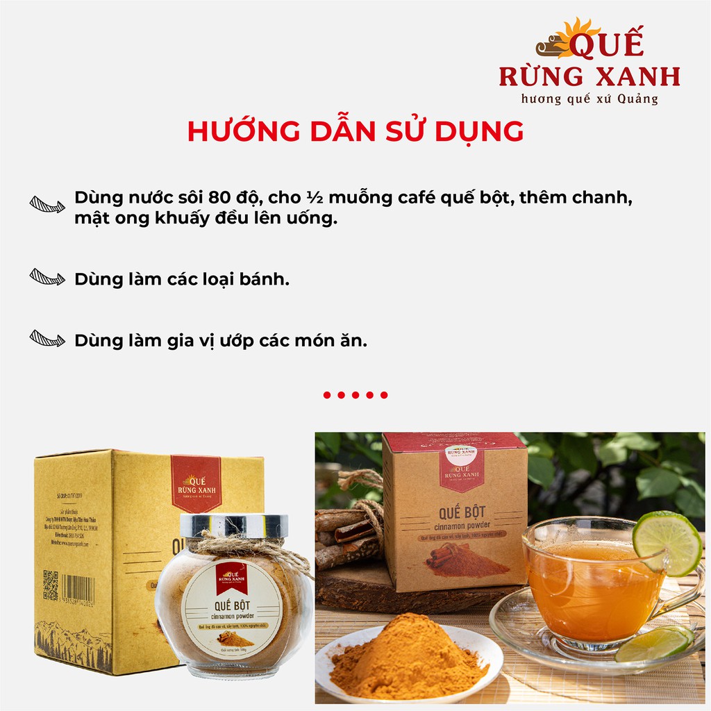 Mua tại TiktokBột quế tạo ra từ vỏ của cây quế khi đã xay nhuyễn, thơm và giữ được mùi hương lâu, được làm từ 100% bột quế nguyên chất từ rừng Trà Bồng Quảng Ngãi. Theo Y học cổ truyền, Quế được ví như Sâm trong Tứ Đại Danh Dược bao gồm: Sâm - Nhung - Quế - Phụ. Với truyền thống lâu đời trong lĩnh vực thuốc nam - Hơn 30 năm kinh nghiệm kinh doanh quế ở phố Đông y Sài Gòn, lần đầu tiên Quế Rừng Xanh mang giá trị cây quế đến với người tiêu dùng một cách tiện lợi nhất bằng cả tâm huyết của mình.