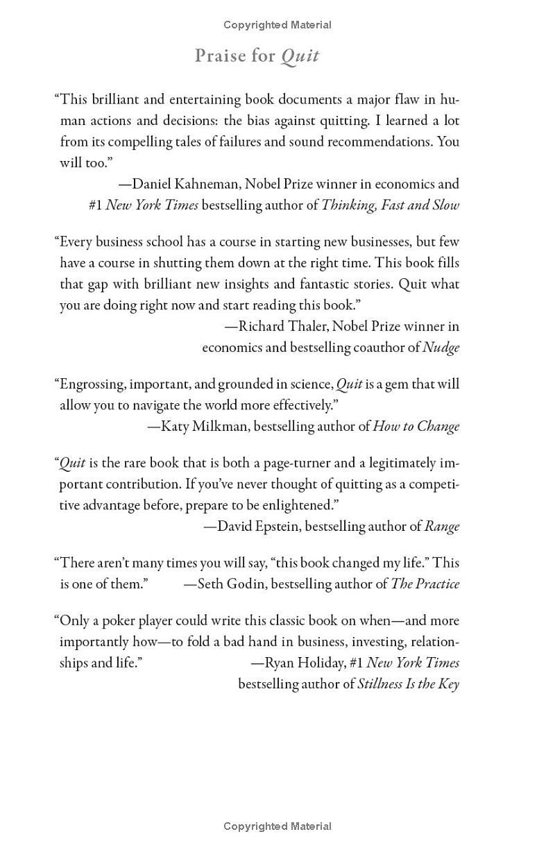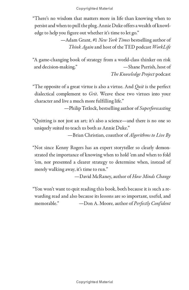 In Quit, Duke teaches you how to get good at quitting. Drawing on stories from elite athletes like Mount Everest climbers, founders of leading companies like Stewart Butterfield, the CEO of Slack, and top entertainers like Dave Chappelle, Duke explains why quitting is integral to success, as well as strategies for determining when to hold em, and when to fold em, that will save you time, energy, and money. You'll learn: