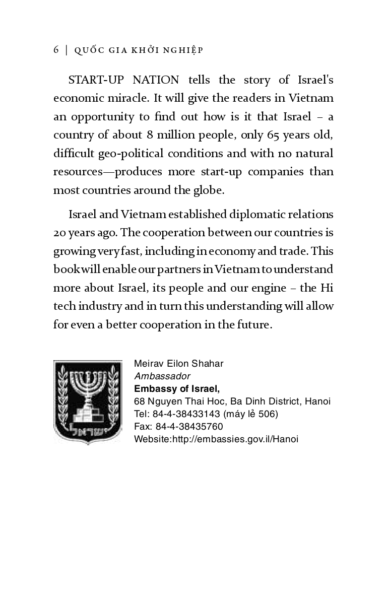 Là câu chuyện viết về sự phát triển thần kỳ của nền kinh tế Israel từ lúc lập quốc cho đến khi trở thành quốc gia có nền công nghệ hàng đầu thế giới. Quyển sách này có thể trả lời cho những thắc mắc làm thế nào một đất nước nhỏ bé lại có thể tồn tại giữa sự thù địch của các quốc gia lân cận, đối phó với những cuộc chiến giữ vững bờ cõi mà vẫn tạo ra sự sáng tạo vượt bậc trong các lĩnh vực công nghệ, quân sự và dân sự. Với ngòi bút sắc sảo, phong phú và tập trung những lời nhận xét thực tế từ những doanh nhân thành công hàng đầu, “Quốc gia khởi nghiệp” đã đem đến những cái nhìn mới mẻ về con người và đất nước Israel, làm sáng tỏ phần nào những thành công tưởng chừng như không tưởng của đất nước nhỏ bé này. Cá tính quyết liệt, dám thách thức và sáng tạo không ngừng của những con người Do Thái lưu vong, chạy trốn và sống sót sau những cuộc thảm sát trong Chiến tranh thế giới thứ II, không cam chịu cuộc sống nghèo khó, họ đã cùng với những người theo Chủ nghĩa Phục quốc Do Thái gây dựng và bảo vệ đất nước Israel bằng chính sức lực của mình và khiến cả thế giới phải kinh ngạc.Ngày nay, Israel là một trong những quốc gia có nền kinh tế phát triển nhất thế giới và có lĩnh vực công nghệ phát triển không hề thua kém Thung lũng Silicon của Hoa Kỳ. “Quốc gia khởi nghiệp” được xuất bản với hy vọng sẽ đem đến cho độc giả những bài học về khởi nghiệp của một quốc gia luôn có nền kinh tế phát triển sôi động, con người thì luôn hướng đến sự cách tân và hướng đến một tương lai tươi sáng hơn.