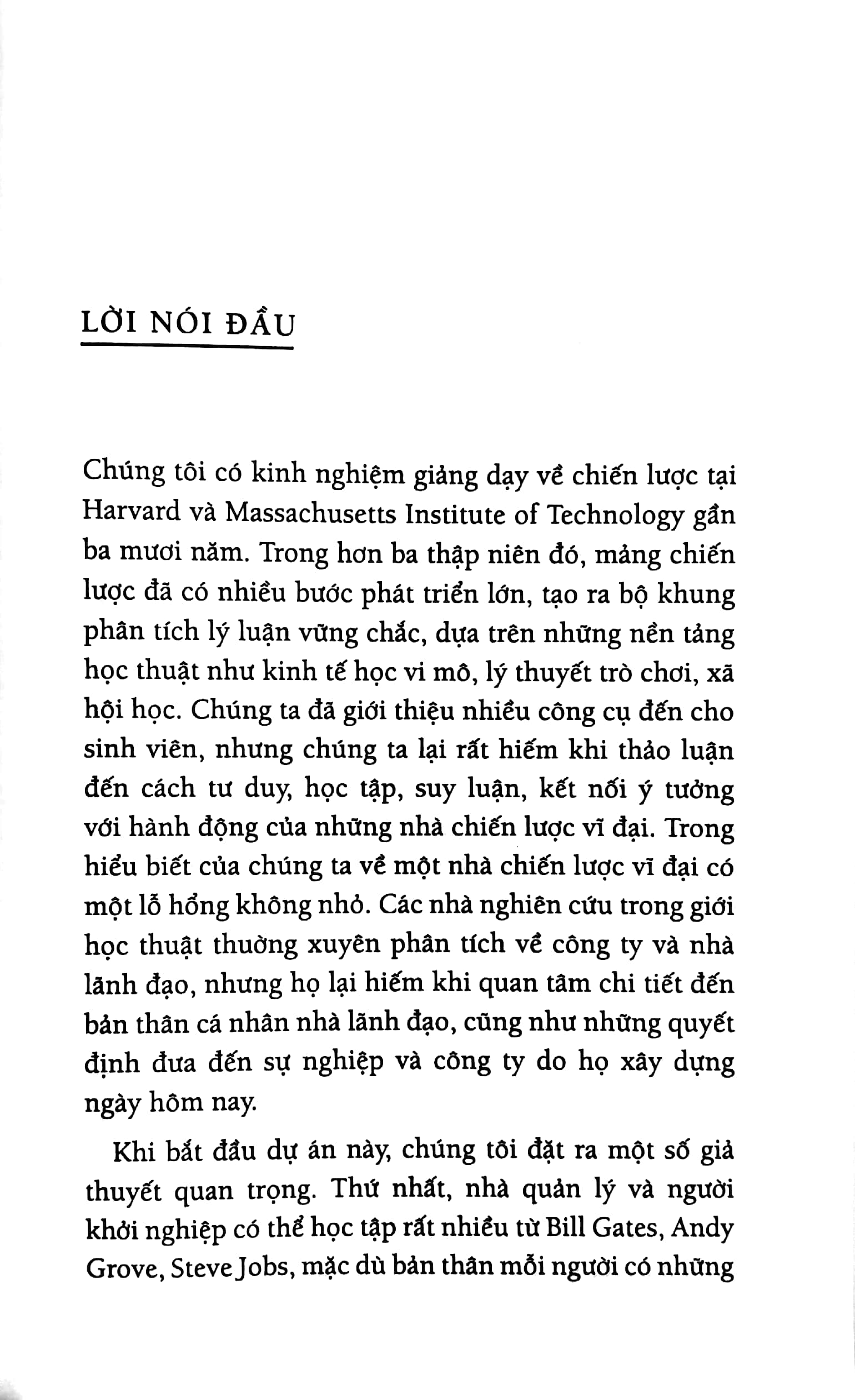 Giáo sư David Yoffie và Michael Cusumano đã theo đuổi nghiên cứu về ba nhà lãnh đạo và ba công ty suốt gần 30 năm, trong quá trình giảng dạy về chiến lược kinh doanh, sáng tạo đột phá, khởi nghiệp tại Trường Kinh doanh Harvard và Trường Quản lý Sloan thuộc Học viện Công nghệ Massachusetts (MIT). Trong quyển sách này, hai giáo sư trình bày việc Gates, Grove, và Jobs đã trở thành những bậc thầy về chiến lược như thế nào? Trong vai trò CEO, cả ba tiếp cận chiến lược và thực thi rất giống nhau – nhưng lại hoàn toàn khác với đối thủ – bằng cách chú trọng đến năm quy luật sau: