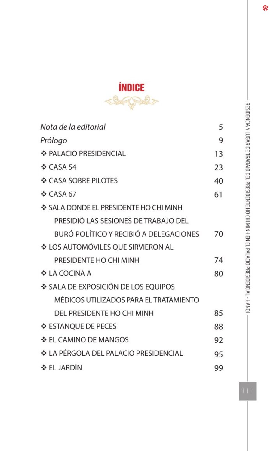 El libro Residencia y lugar de trabajo del presidente Ho Chi Minh en el Palacio Presidencial - Hanoi ofrece a los lectores un recurso valioso que nos ayuda a comprender mejor la vida del amado líder del de la nación vietnamita. El libro recrea de forma realista y lleva al lector a cada pequeño rincón, a cada recuerdo, a cada historia sencilla pero impregnada de significado histórico y humano sobre los lugares asociados al presidente Ho Chi Minh en el Palacio Presidencial como: la Casa 54, la Casa sobre pilotes, la Casa 67, el estanque de peces, el camino de mangos, lentre otros.