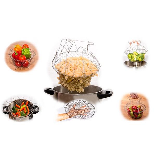 Rổ được thiết kế với các sợi Inox SUS 304 tinh khiết an toàn, đan xéo với nhau. Với thiết kế có thể thay đổi hình dàng và công năng khi sử dụng