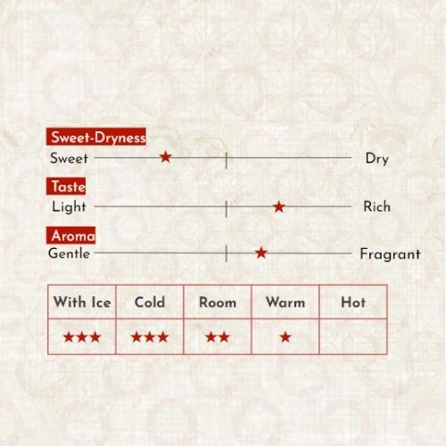 Được ủ trong thùng gỗ tuyết tùng ngay trước khi đóng chai, loại rượu Sake Taru ("thùng") này bùng nổ với hương vị nồng nàn và đặc sắc. Có vị cay và hương thơm thảo