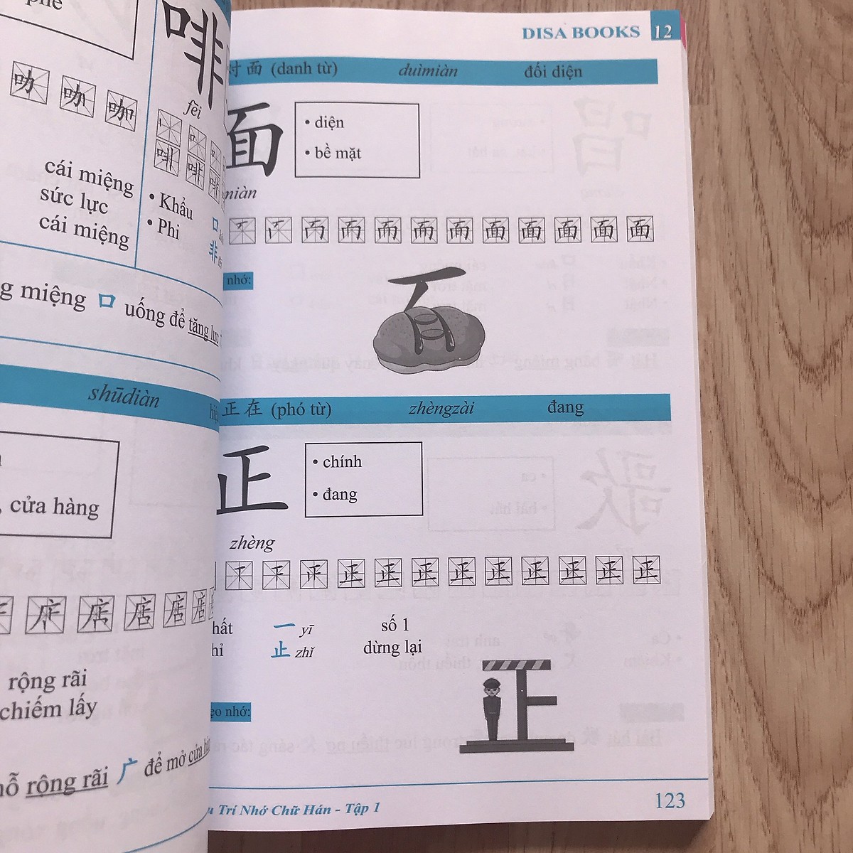 - Siêu trí nhớ chữ Hán tập 02 (In màu, có Audio nghe) Nội dung sách: Giúp bạn dễ dàng nhớ ngay 1000 chữ Hán chỉ sau 2 tháng thông qua mẹo nhớ và hình ảnh dễ hiểu. Tác giả: Diệu Hồ – Phạm Thành Luân Số trang: 268 Năm xuất bản: 2019 Nhà Xuất Bản: Đà Nẵng Cách nhớ chữ Trung Quốc (chữ Hán) a. Nhớ chữ Hán bằng các bộ thủ Bộ thủ chính là cách nhớ chữ Hán hiệu quả nhất, mỗi bộ thủ trong tiếng Hán lại biểu hiện một hiện tượng sự vật riêng. Nhớ được các bộ thủ đó chính là đã nhớ cách viết tiếng Trung như thế nào. Và việc còn lại chính là ghép các bộ thủ đó với nhau để tạo nên được một chữ hoàn chỉnh. vd: chữ 安 Ở trên là bộ 宀 miên => mái nhà mái che, Ở dưới là bộ女 nữ => nữ giới, con gái, đàn bà. Người phụ nữ ở dưới trong nhà thì rất “an” toàn. Ví dụ: 安全 (Ānquán) – An Toàn. Mẹo nhỏ cho những người mới học viết tiếng Trung có thể nhớ đó là dùng các mảnh giấy nhớ, ghi lại những bộ thủ hay những từ mới bằng việc tập viết tiếng Trung. Để những mảnh giấy nhớ đó ở những nơi dễ thấy. Việc nhìn liên tục đó sẽ giúp bạn vừa có thể nhớ chữ vừa có thể nhớ từ. b. Cách nhớ chữ Hán qua thơ Các từ chữ Hán được học bằng cách gieo vần nhịp để người học nhớ chữ Hán dễ hơn như: “Chim chích mà đậu cành tre Thập trên tứ dưới nhất đè chữ tâm” (Chữ Đức) Hay: “Tai nghe miệng nói đít làm vua”. (Chữ Thánh) Nhớ chữ Hán bằng cách vẽ lại những từ đấy. Nhớ các nét, mô phỏng lại và vẽ, đây là một trong những cách rất tốt để nhớ chữ Hán Chữ Hán có hai cách viết là giản thể và phồn thể. Đa phần các giáo trình tiếng Trung đều là chữ giản thể do đó rất nhiều trường hợp đã gặp lúng túng khi tiếp xúc với chữ phồn thể. Nếu để ý thì cách chữ phồn thể có cách viết chỉ khác chữ giản thể một chút. Trong quá trình học, đừng ngần ngại mà nhờ giáo viên chỉ hướng dẫn cách viết chữ phồn thể (viết tiếng trung) nếu công việc của bạn phải tiếp xúc với kiểu chữ này.