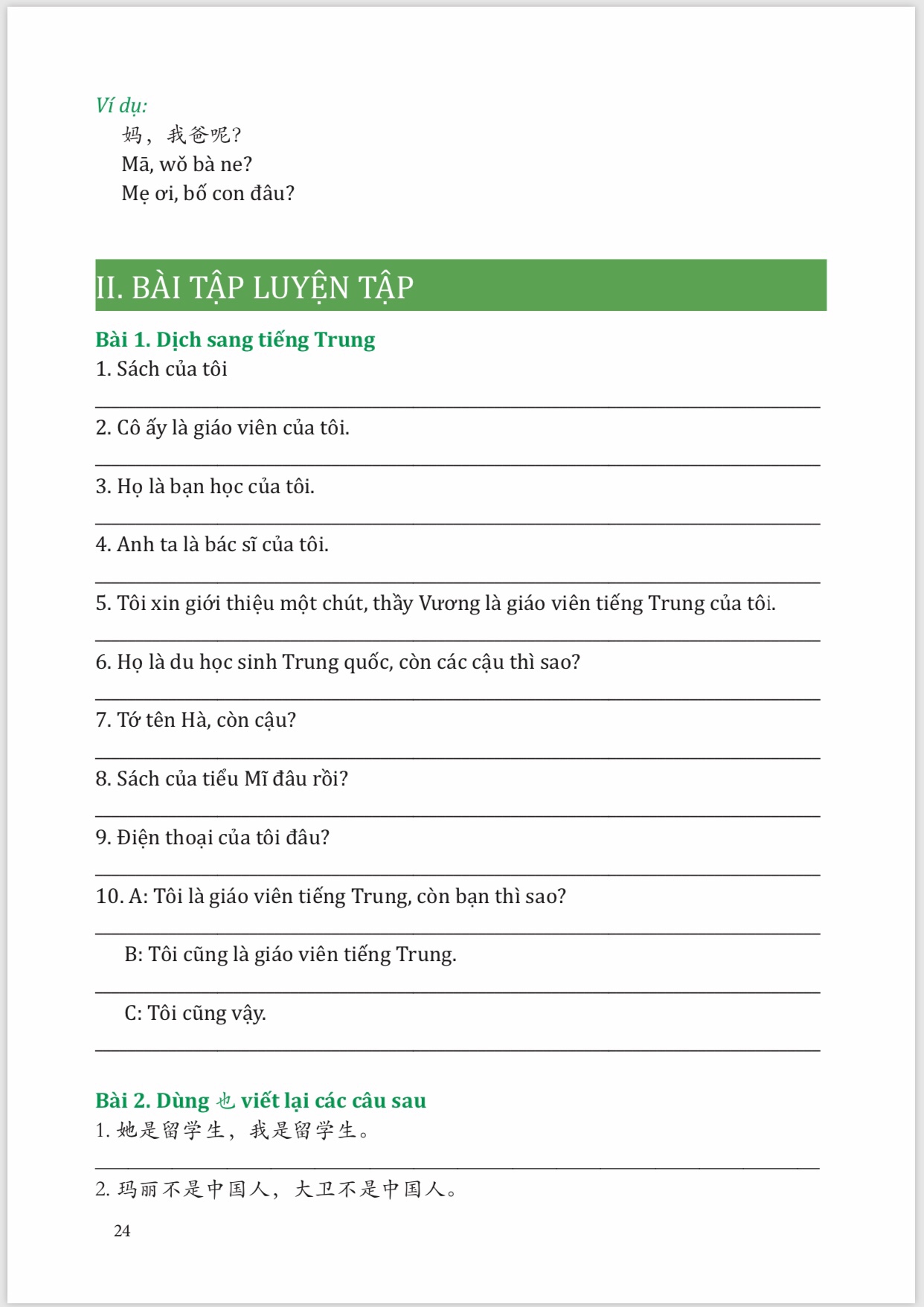 1.BÀI TẬP DỊCH TRUNG VIỆT-VIỆT TRUNG CỦNG CỐ CẤU TRÚC CỐ ĐỊNH & NGỮ PHÁP (Dựa theo ngữ pháp tiếng Hán Sơ trung cấp hiện đại" Loại bìa Bìa mềm Số trang 340 SKU
