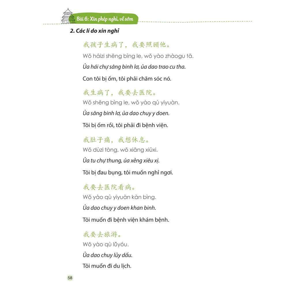 Ngoài việc cung cấp những mẫu câu giao tiếp hàng ngày (bao gồm phần chữ Hán, phiên âm chuẩn quốc tế, phần âm mô phỏng bằng tiếng Việt - âm bồi, phần dịch nghĩa), cuốn sách còn đưa ra rất nhiều công thức ngắn gọn với giải thích đơn giản, dễ hiểu, cùng hệ thống từ mới theo chuyên ngành giúp người học có thể vận dụng kiến thức một cách linh hoạt trong công việc và cuộc sống.