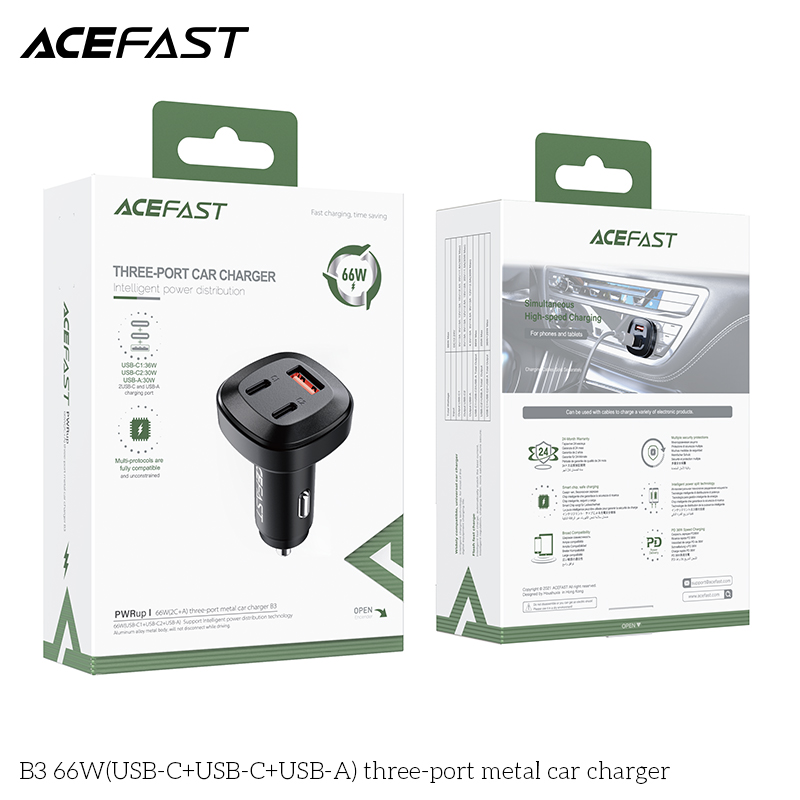 Mua tại TiktokBộ sạc ô tô ACEFAST B3, tổng công suất 66W, vật liệu thân bằng hợp kim nhôm, hỗ trợ hầu hết các giao thức sạc nhanh Thông số kỹ thuật: - Input: DC12-24V. - Output: USB-C1: 36W, USB-C2: 30W, USB-A: 30W, USB-C1 + USB-C2: 36W + 30W, USB-C1 + USB-A: 36W + 30W, USB-C1 + USB-C2 + USB-A: 5V / 5A. Hỗ trợ cho PD3.0, cho PPS, cho QC4.0, cho AFC, cho FCP, cho SCP và các giao thức sạc nhanh khác.