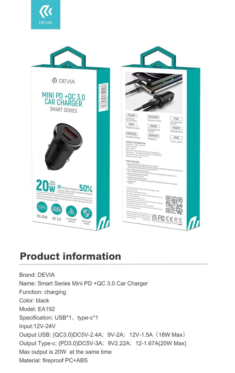 ✨Sạc trên xe hơi Devia Mini hỗ trợ sạc nhanh PD + QC (20W)- Hàng chính hãng