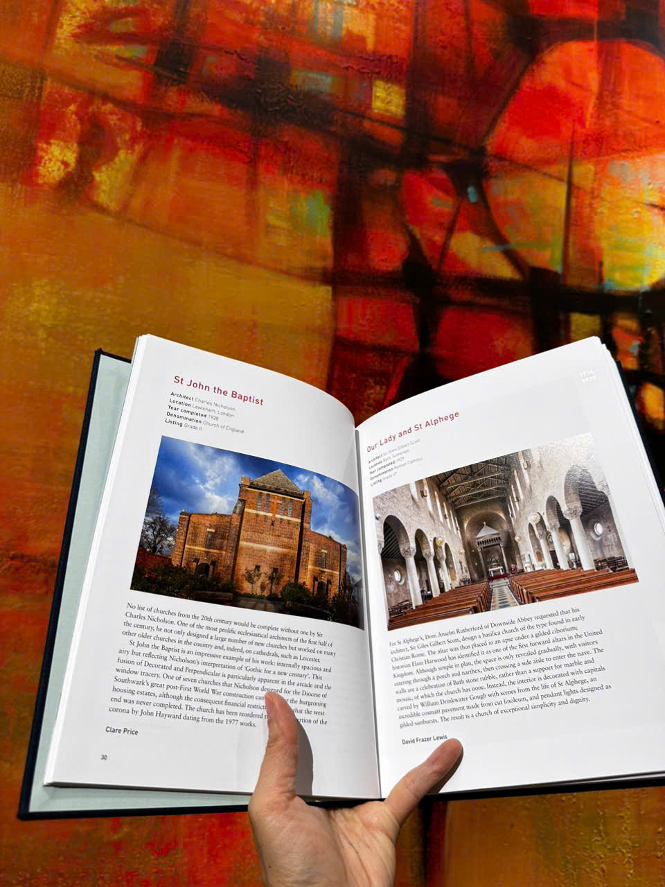 Các kiến ​​trúc sư có tác phẩm được đưa vào đây bao gồm Basil Spence và Edward Maufe, những nhà thiết kế của các thánh đường lớn, cho đến Gillespie, Kidd và Coia cấp tiến có chủng viện theo chủ nghĩa tàn bạo bị bỏ hoang gần Dumbarton. Cuốn sách cung cấp tiểu sử của các nhà thiết kế lớn; các bài viết về kính, phụ kiện cũng như về giáo đường Do Thái, nhà thờ Hồi giáo và đền thờ đóng vai trò nội tại và quan trọng trong việc thờ cúng ở Anh ngày nay. Những người đóng góp bao gồm các nhà sử học kiến ​​trúc Elain Harwood, Alan Powers và Clare Price.