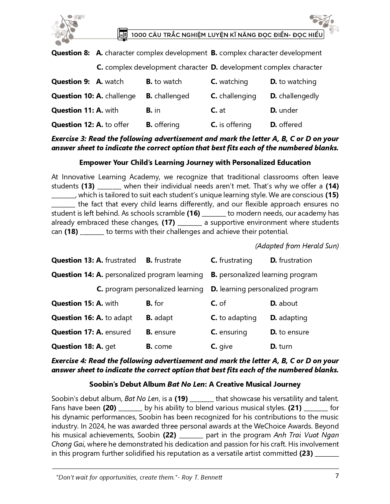 Mua tại TiktokCác kỳ thi Tốt nghiệp THPT Quốc gia và Đánh giá năng lực ngày càng chú trọng vào kỹ năng đọc hiểu, vì vậy việc rèn luyện phương pháp và thực hành thường xuyên là chìa khóa để đạt điểm cao. Cuốn sách "1000 Câu Trắc Nghiệm Luyện Kỹ Năng Đọc Điền – Đọc Hiểu Môn Tiếng Anh" được biên soạn nhằm giúp các em nâng cao kỹ năng này, với hệ thống bài tập đa dạng, bám sát cấu trúc đề thi thực tế. Bố cục sách gồm 4 chuyên đề trọng tâm Chuyên đề 1: Đọc điền quảng cáo Chuyên đề 2: Đọc điền tờ rơi Chuyên đề 3: Đọc điền khuyết thông tin Chuyên đề 4: Đọc hiểu