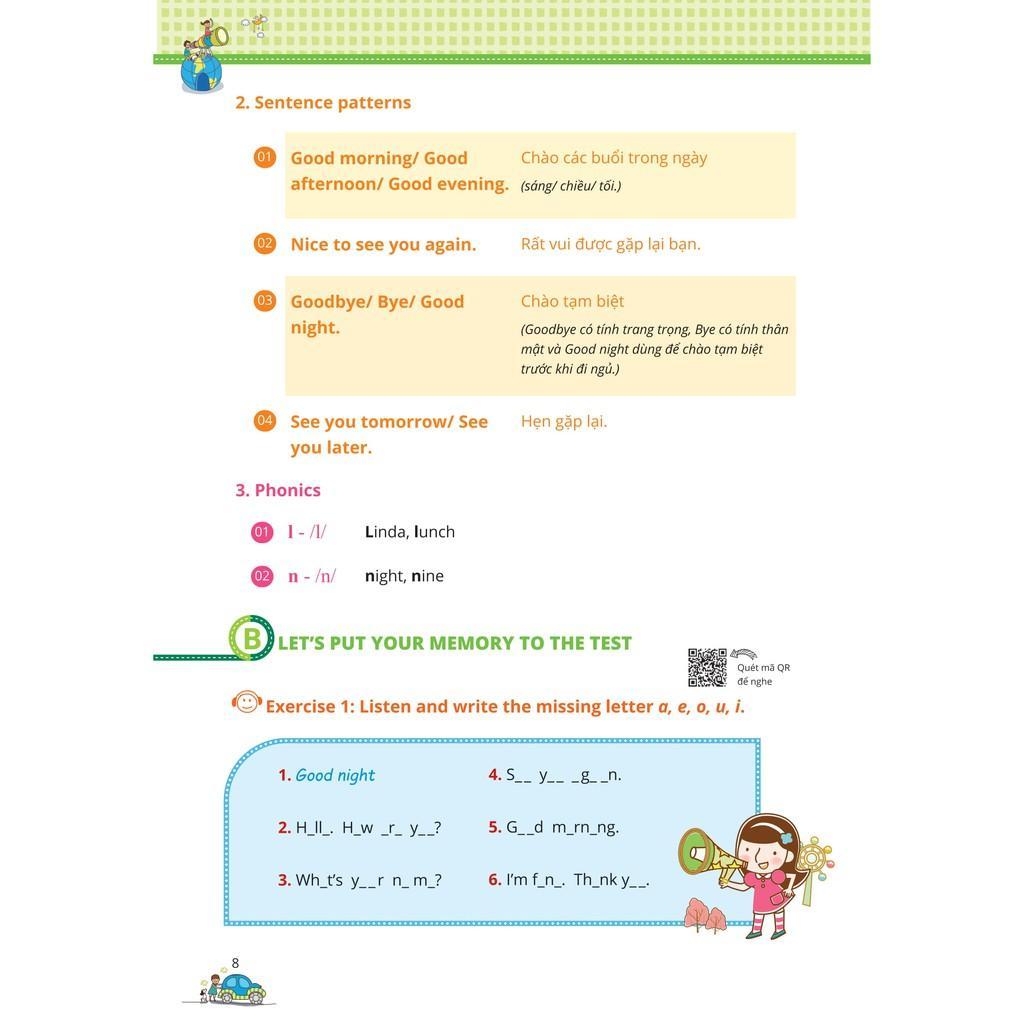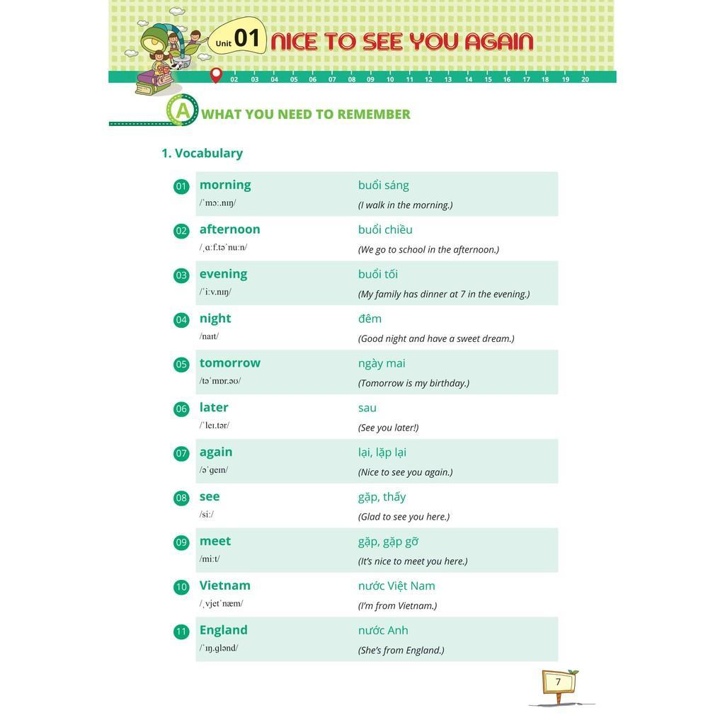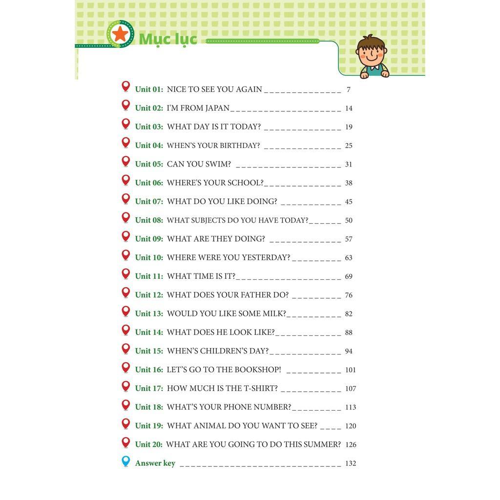 - Cấu trúc bài học chặt chẽ – Ôn tập toàn diện, ghi nhớ nhanh A. Kiến thức cần nhớ – What you need to remember Phần lý thuyết ngắn gọn, giúp các em ôn tập toàn bộ kiến thức từ vựng, cấu trúc và ngữ âm theo mỗi unit trên lớp B Bài kiểm tra tổng hợp – Let’s put your memory to the test Bài kiểm tra tổng hợp các dạng bài tập thực hành: Trắc nghiệm chọn câu đúng, nghe và điền từ, tìm lỗi sai, nối, hoàn thành câu… C. Đáp án – Answer key Đáp án và lời giải chi tiết cuối sách giúp các em tự đánh giá lại mức độ thông hiểu và ghi nhớ, khắc sâu thêm kiến thức