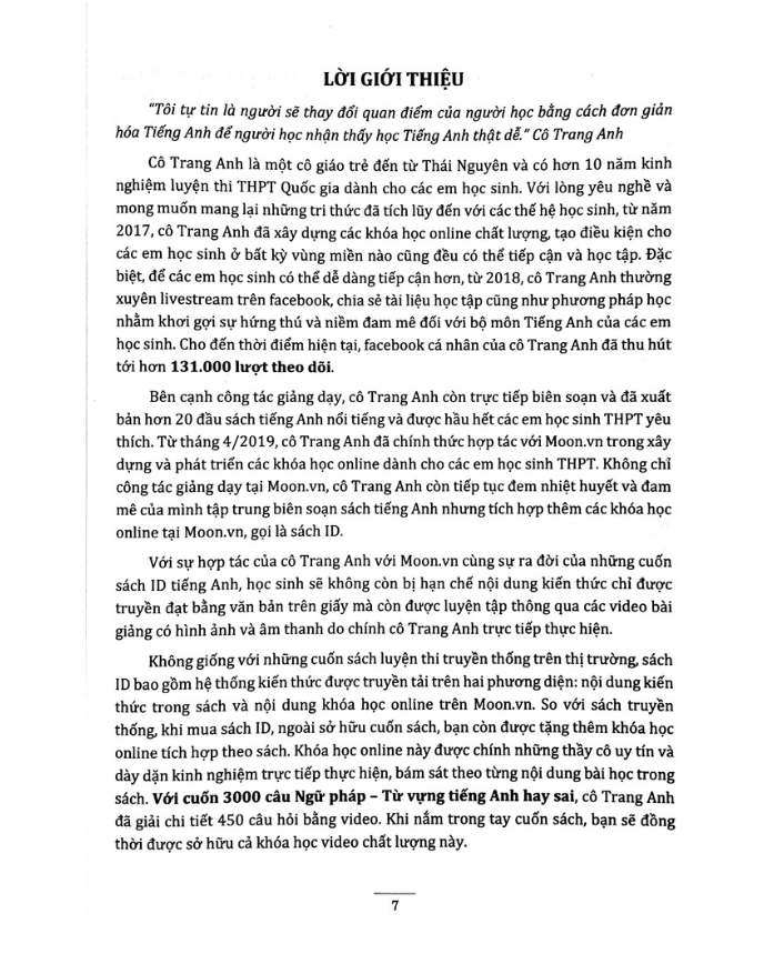 Mục đích của Cô Trang Anh khi viết cuốn sách là giúp các em rèn tính cẩn thận và có kiến thức sâu rộng về từ vựng và ngữ pháp. ĐIỂM ĐẶC BIỆT TRONG SÁCH TIẾNG ANH CÔ TRANG ANH: ️ Tích hợp với khóa học Ngữ pháp từ vựng hay sai trong sách cô Trang Anh
