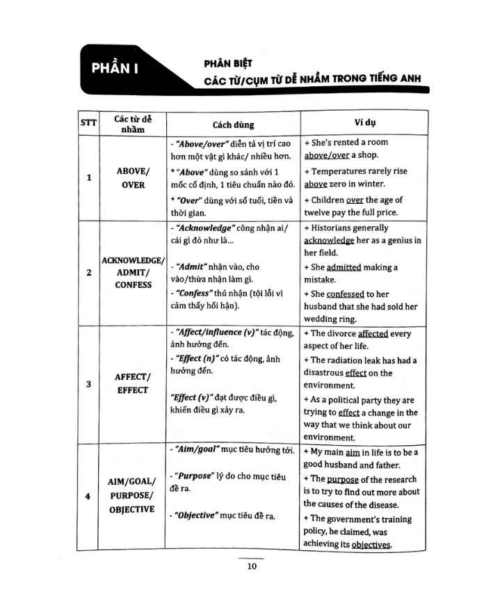 NỘI DUNG CHI TIẾT SÁCH CÔ TRANG ANH 3000 câu ngữ pháp và từ vựng hay sai Phần 1: Những từ DỄ GÂY NHẦM LẪN- Hệ thống từ đồng nghĩa, đồng âm và phân biệt sự khác nhau trong ý nghĩa cũng như cách dùng của các từ đó. Bên cạnh những ví dụ minh hoạ cho từng phầ