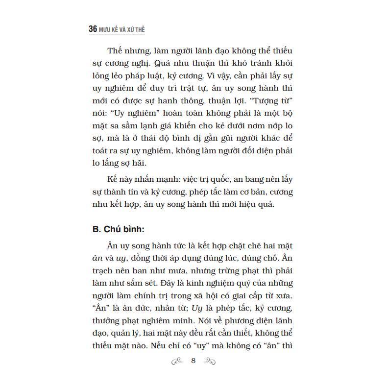 “36 Mưu Kế Và Xử Thế” có kết cấu chia làm bốn phần lớn là Chiến thắng kế, Cường chiến kế, Nhược chiến kế, Thối chiến kế. Trong mỗi phần lớn lại chia ra các kế nhỏ giúp người đọc dễ nắm bắt và tiếp thu. Không chỉ mang tíh thực tế cao cuốn sách cò chứa đựng giá trị nhân văn sâu sắc, thiết thực trong đời sống.