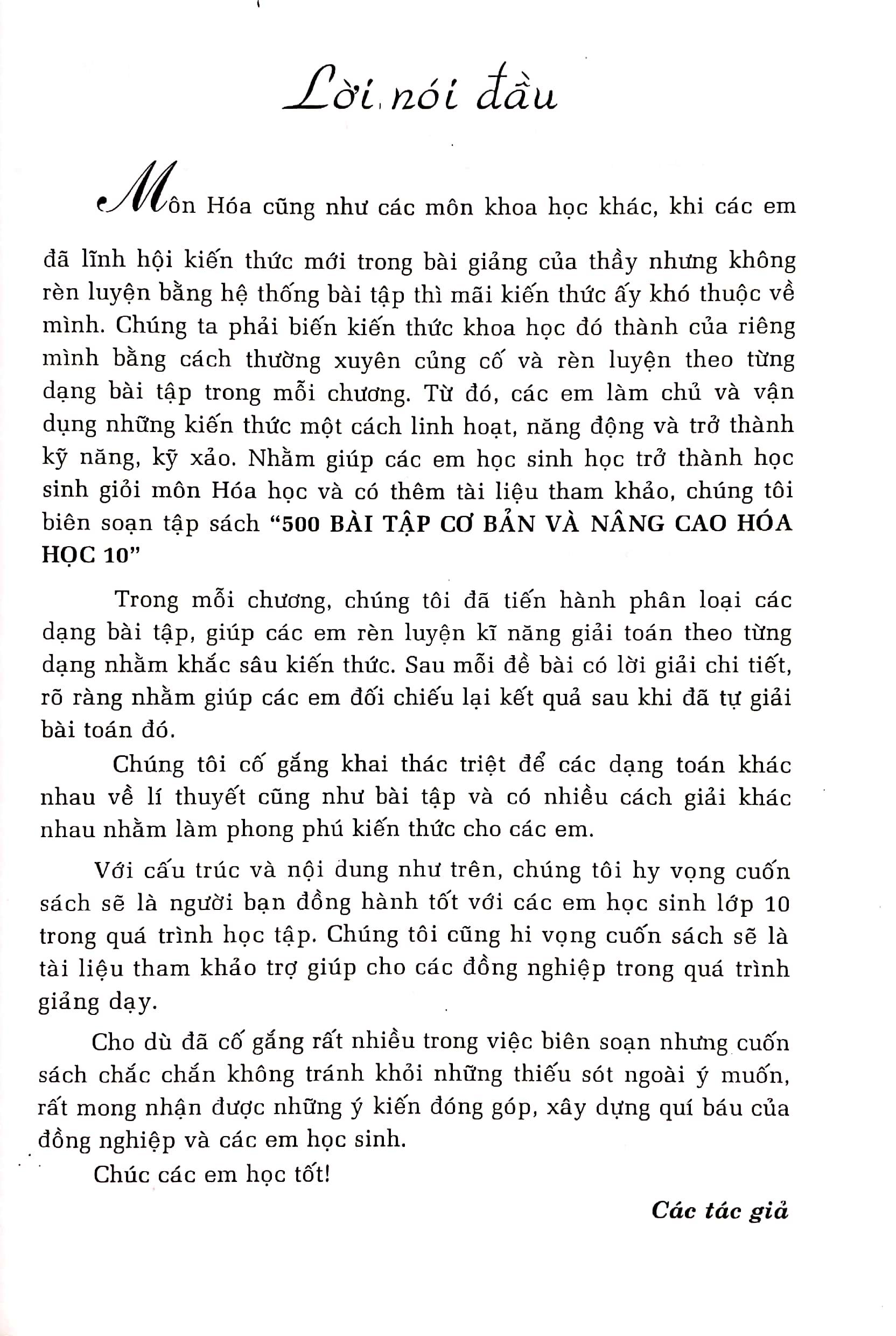 Môn Hóa cũng như các môn khoa học khác, khi các em đã lĩnh hội kiến thức mới trong bài giảng của thầy nhưng không rèn luyện bằng hệ thống bài tập thì mãi kiến thức ấy khó thuộc về m.ình. Chúng ta phải biến kiến thức khoa học đó thành của riêng m.ình bằng cách thường xuyên củng cố và rèn luyện theo từng dạng bài tập trong mỗi chương. Từ đó, các em làm chủ và vận dụng những kiến thức một cách linh hoạt, năng động và trở thành kỹ năng, kỹ xảo. Nhằm giúp các em học sinh học trở thành học sinh giỏi môn Hóa học và có thêm tài liệu tham khảo, chúng tôi biên soạn tập sách “500 BÀI TẬP CƠ BẢN VÀ NÂNG CAO HÓA HỌC 10”