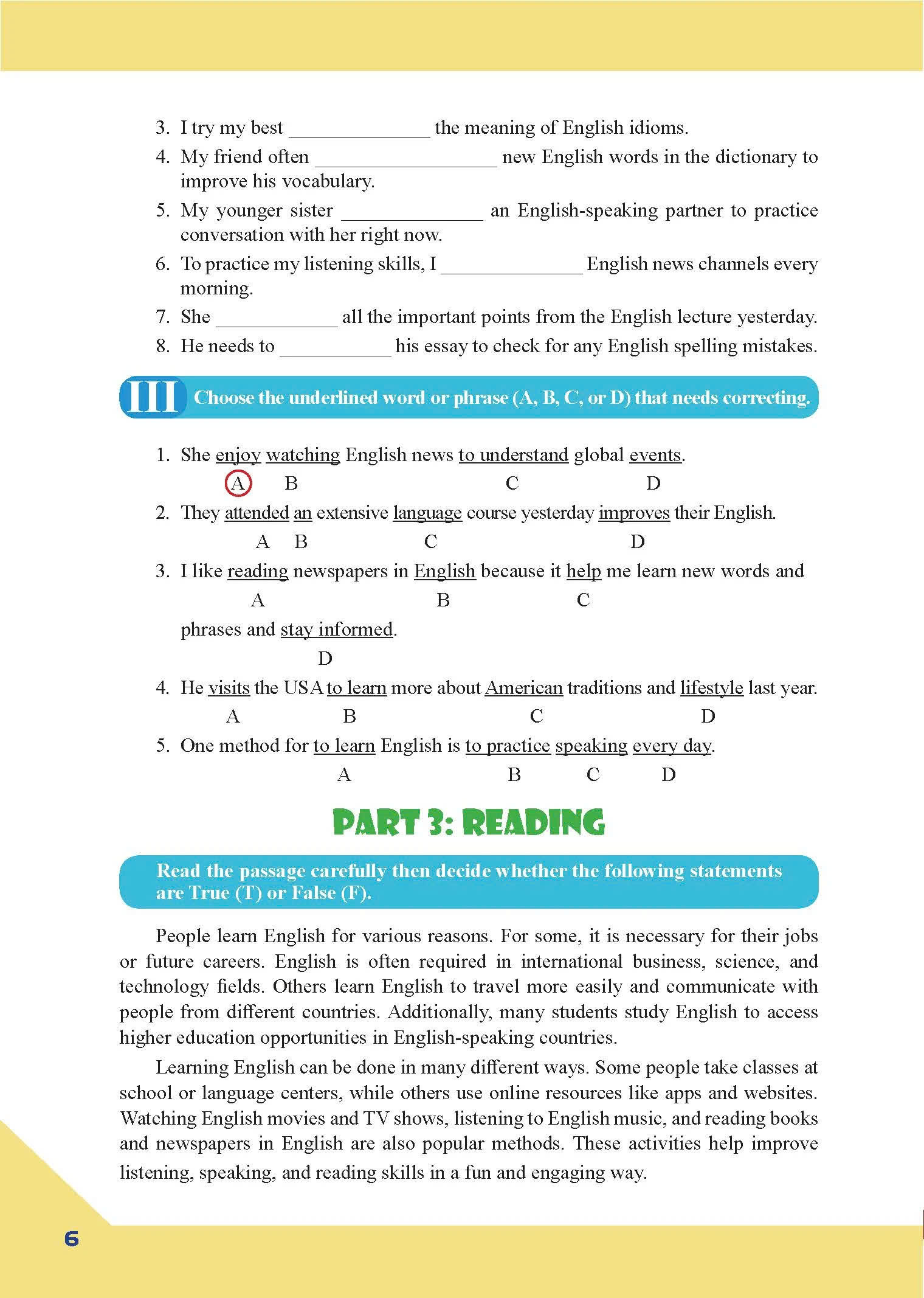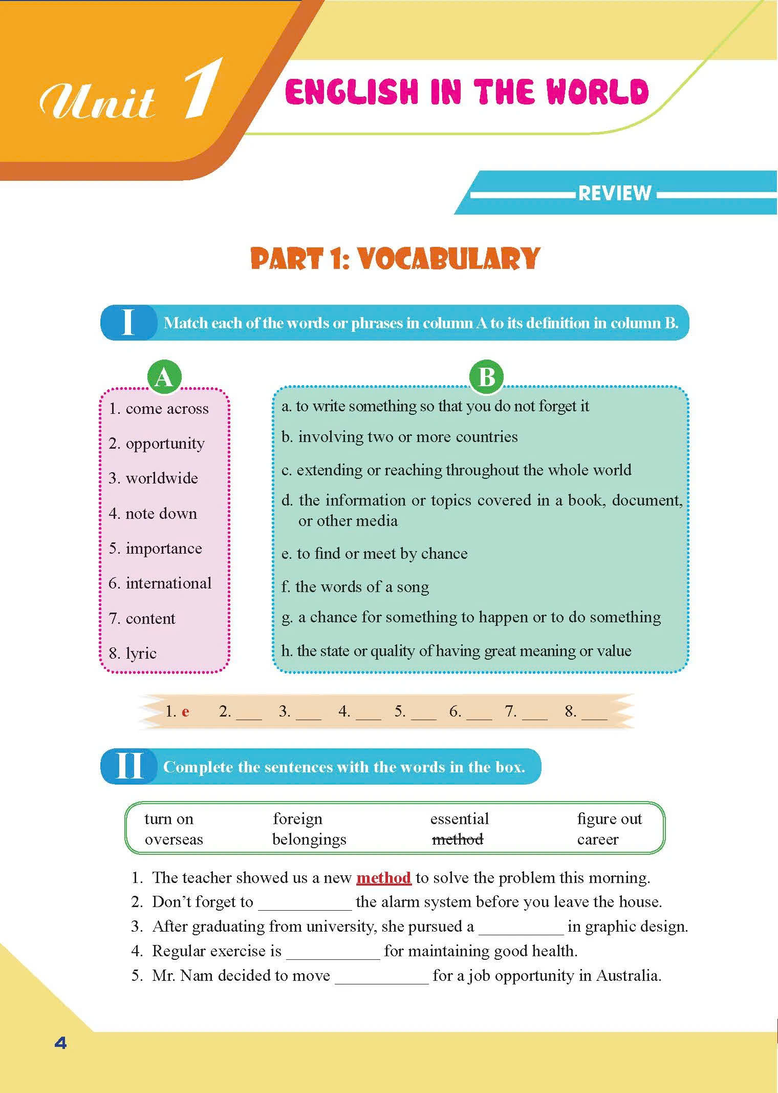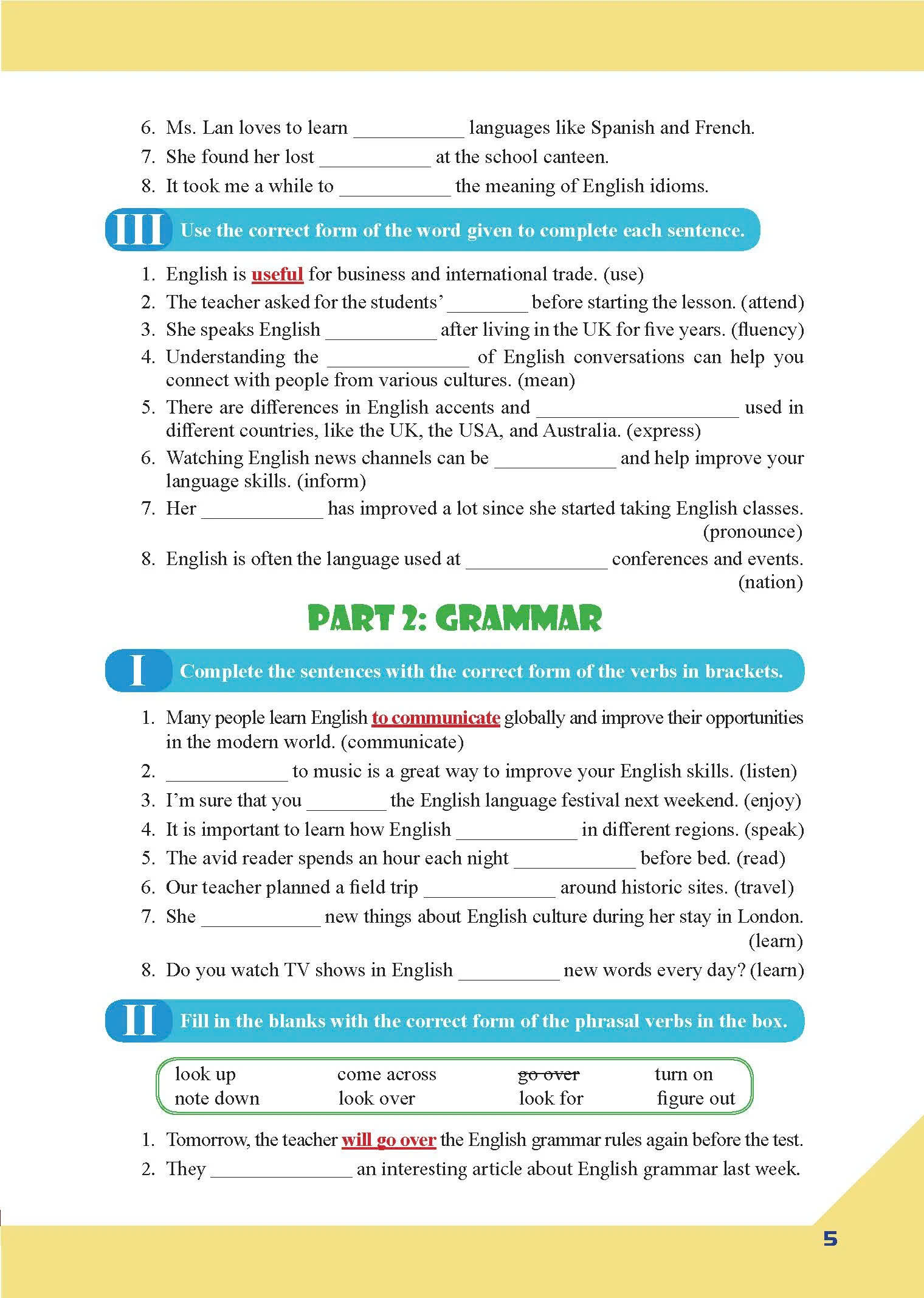 Hệ thống bài tập đa dạng: Bao gồm các dạng bài tập từ cơ bản đến nâng cao, giúp học sinh rèn luyện toàn diện 4 kỹ năng: Nghe - Nói - Đọc - Viết.