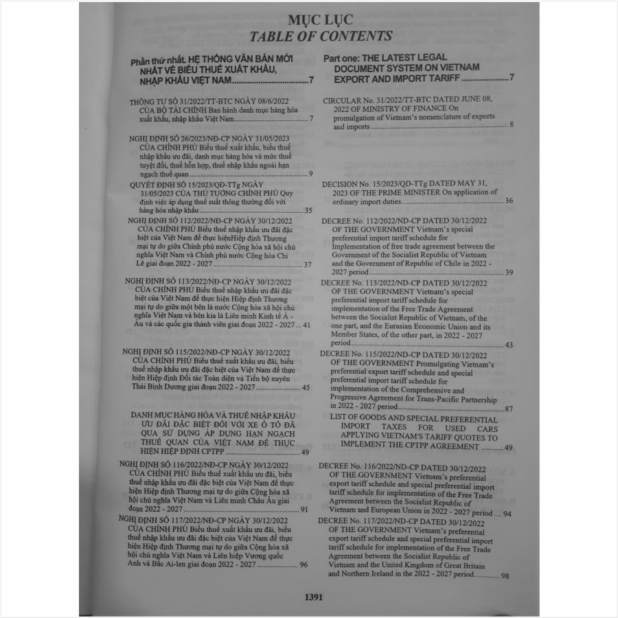 - Toàn bộ sách bìa mềm khổ lớn 20 x 28 cm phân phối bởi Nhà sách Nam Việt đều được bọc sách Plastic MIỄN PHÍ và xuất hóa đơn điện tử đầy đủ, nhanh chóng. …/… Lời giới thiệu: Nhằm triển khai cam kết thuế xuất nhập khẩu của Việt Nam trong các Hiệp định Thương mại, Hiệp định Đối tác kinh tế, ngày 30/12/2022, Chính phủ đã ký ban hành 16 nghị định về biểu thuế xuất khẩu ưu đãi, biểu thuế nhập khẩu ưu đãi đặc biệt của Việt Nam giai đoạn 2022-2027. Nội dung của 16 nghị định này thống nhất với danh mục hàng hóa xuất khẩu, nhập khẩu Việt Nam theo AHTN 2022 quy định tại Thông tư số 31/2022/TT-BTC ngày 08/6/2022 của Bộ Tài chính. 16 Nghị định mới được ban hành gồm: Nghị định 112/2022/NĐ-CP ngày 30/12/2022 về Biểu thuế nhập khẩu ưu đãi đặc biệt của Việt Nam để thực hiện Hiệp định Thương mại tự do giữa Việt Nam – Chi Lê giai đoạn 2022-2027. Nghị định số 113/2022/NĐ-CP ngày 30/12/2022 Biểu thuế nhập khẩu ưu đãi đặc biệt của Việt Nam để thực hiện Hiệp định Thương mại tự do giữa một bên là nước Cộng hòa xã hội chủ nghĩa Việt Nam và bên kia là Liên minh Kinh tế Á – Âu và các quốc gia thành viên giai đoạn 2022 – 2027. Nghị định số 114/2022/NĐ-CP ngày 30/12/2022 Biểu thuế nhập khẩu ưu đãi đặc biệt của Việt Nam để thực hiện Hiệp định Thương mại giữa Chính phủ nước Cộng hòa xã hội chủ nghĩa Việt Nam và Chính phủ nước Cộng hòa Cuba giai đoạn 2022 – 2027. Nghị định số 115/2022/NĐ-CP ngày 30/12/2022 Biểu thuế xuất khẩu ưu đãi, Biểu thuế nhập khẩu ưu đãi đặc biệt của Việt Nam để thực hiện Hiệp định Đối tác Toàn diện và Tiến bộ xuyên Thái Bình Dương giai đoạn 2022 – 2027. Nghị định số 116/2022/NĐ-CP ngày 30/12/2022 Biểu thuế xuất khẩu ưu đãi, Biểu thuế nhập khẩu ưu đãi đặc biệt của Việt Nam để thực hiện Hiệp định Thương mại tự do giữa Cộng hòa xã hội chủ nghĩa Việt Nam và Liên minh Châu Âu giai đoạn 2022 – 2027. Nghị định số 117/2022/NĐ-CP ngày 30/12/2022 Biểu thuế xuất khẩu ưu đãi, Biểu thuế nhập khẩu ưu đãi đặc biệt của Việt Nam để thực hiện Hiệp định Thương mại tự do giữa Cộng hòa xã hội chủ nghĩa Việt Nam và Liên hiệp Vương quốc Anh và Bắc Ireland giai đoạn 2022 – 2027. Nghị định số 118/2022/NĐ-CP ngày 30/12/2022 Biểu thuế nhập khẩu ưu đãi đặc biệt của Việt Nam để thực hiện Hiệp định Thương mại hàng hóa ASEAN – Trung Quốc giai đoạn 2022 – 2027. Nghị định số 119/2022/NĐ-CP ngày 30/12/2022 Biểu thuế nhập khẩu ưu đãi đặc biệt của Việt Nam để thực hiện Hiệp định Thương mại Hàng hóa ASEAN – Hàn Quốc giai đoạn 2022 – 2027. Nghị định số 120/2022/NĐ-CP ngày 30/12/2022 Biểu thuế nhập khẩu ưu đãi đặc biệt của Việt Nam để thực hiện Hiệp định Đối tác kinh tế toàn diện ASEAN – Nhật Bản giai đoạn 2022 – 2028. Nghị định số 121/2022/NĐ-CP ngày 30/12/2022 Biểu thuế nhập khẩu ưu đãi đặc biệt của Việt Nam để thực hiện Hiệp định thành lập Khu vực Thương mại tự do ASEAN – Australia – New Zealand giai đoạn 2022 – 2027. Nghị định số 122/2022/NĐ-CP ngày 30/12/2022 Biểu thuế nhập khẩu ưu đãi đặc biệt của Việt Nam để thực hiện Hiệp định Thương mại hàng hóa ASEAN – Ấn Độ giai đoạn 2022 – 2027. Nghị định số 123/2022/NĐ-CP ngày 30/12/2022 Biểu thuế nhập khẩu ưu đãi đặc biệt của Việt Nam để thực hiện Hiệp định Thương mại Tự do ASEAN – Hồng Kông, Trung Quốc giai đoạn 2022 – 2027. Nghị định số 124/2022/NĐ-CP ngày 30/12/2022 Biểu thuế nhập khẩu ưu đãi đặc biệt của Việt Nam để thực hiện Hiệp định Đối tác kinh tế Việt Nam – Nhật Bản giai đoạn 2022 – 2028. Nghị định số 125/2022/NĐ-CP ngày 30/12/2022 Biểu thuế nhập khẩu ưu đãi đặc biệt của Việt Nam để thực hiện Hiệp định Thương mại Tự do Việt Nam – Hàn Quốc giai đoạn 2022 – 2027. Nghị định số 126/2022/NĐ-CP ngày 30/12/2022 Biểu thuế nhập khẩu ưu đãi đặc biệt của Việt Nam để thực hiện Hiệp định Thương mại Hàng hóa ASEAN giai đoạn 2022 – 2027. Nghị định số 127/2022/NĐ-CP ngày 30/12/2022 Biểu thuế nhập khẩu ưu đãi đặc biệt của Việt Nam để thực hiện Hiệp định Thương mại giữa Chính phủ nước Cộng hòa xã hội chủ nghĩa Việt Nam và Chính phủ nước Cộng hòa dân chủ nhân dân Lào từ ngày 30/12/2022 đến ngày 4/10/2023. Ngoài ra, ngày 31/05/2023 Chính phủ cũng ban hành Nghị định số 26/2023/NĐ-CP về Biểu thuế xuất khẩu, biểu thuế nhập khẩu ưu đãi, danh mục hàng hóa và mức thuế tuyệt đối, thuế hỗn hợp, thuế nhập khẩu ngoài hạn ngạch thuế quan và Quyết định số 15/2023/QĐ-TTg Quy định việc áp dụng thuế suất thông thường đối với hàng hóa nhập khẩu. …/… Nhằm tạo điều kiện thuận lợi cho các cơ quan hải quan và doanh nghiệp cập nhật và áp dụng mức thuế suất đối với hàng hóa xuất khẩu – nhập khẩu mới một cách kịp thời để thực hiện tốt chính sách thuế được Nhà nước ban hàn