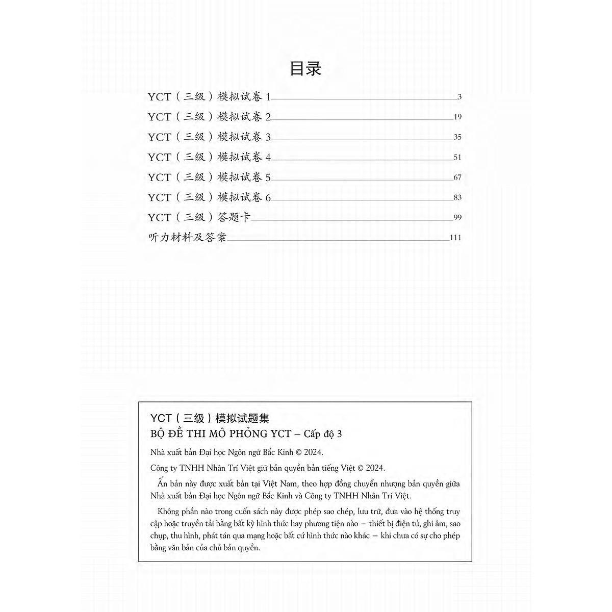 Mua tại TiktokGiới thiệu Kỳ thi tiếng Trung dành cho học sinh (Youth Chinese Test – YCT) là kỳ thi chuẩn ở phạm vi quốc tế nhằm đánh giá khả năng sử dụng tiếng Trung trong cuộc sống hằng ngày cũng như trong học tập của học sinh tiểu học và trung học cơ sở có tiếng mẹ đẻ không phải là tiếng Trung. Bộ đề thi mô phỏng YCT gồm bốn quyển (tương ứng với các cấp độ từ 1 đến 4 của kỳ thi YCT), được biên soạn trên cơ sở bám sát những câu hỏi trong các đề thi YCT gần đây nhằm giúp học sinh ôn thi hiệu quả cũng như tự đánh giá trình độ của bản thân.