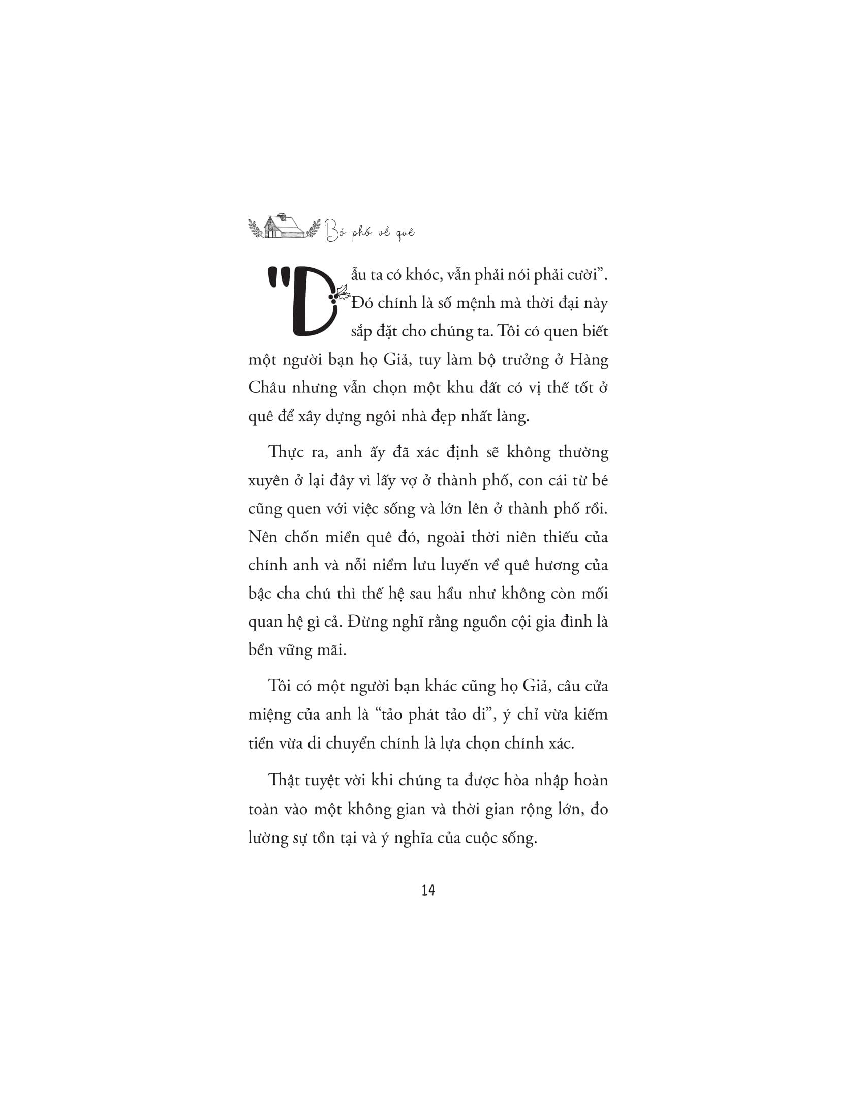 Cuốn sách không chỉ là một lời nhắn nhủ về việc tìm lại giá trị bản thân, mà còn là tiếng nói đồng cảm với những bạn trẻ hiện đại đang khát khao "bỏ phố" để tìm kiếm sự cân bằng và ý nghĩa mới trong cuộc sống. Thông qua câu chuyện của m.ình, Chu Tử Nhất mang đến một góc nhìn đầy cảm hứng về lối sống gần gũi với thiên nhiên: một cuộc sống chậm rãi, nhưng sâu sắc và giàu kết nối. Anh học cách hòa m.ình vào nhịp sống bình dị của nông thôn, xây dựng mối quan hệ chân thành với những người dân bản địa, và từ đó, khám phá cách biến cuộc sống ở quê nhà không chỉ là sự tồn tại, mà còn là sự thăng hoa đầy ý nghĩa.