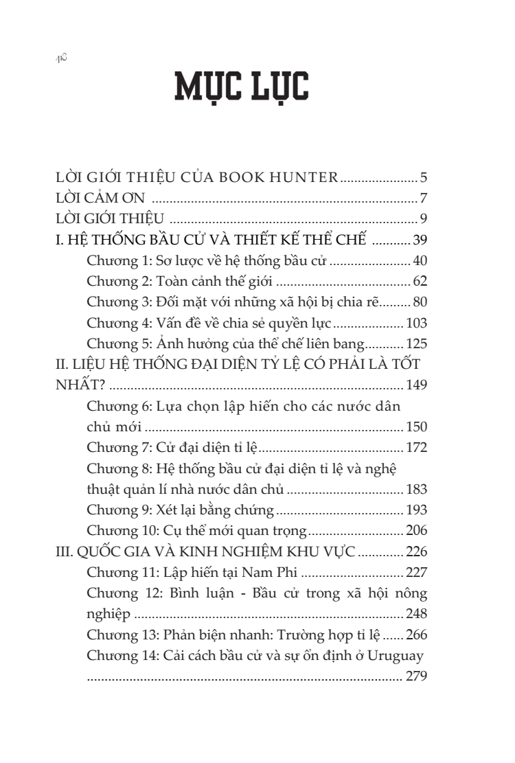 Cuốn sách được chia thành 3 phần: Phần 1 quan tâm đến sự đa dạng của hệ thống bầu cử trên thế giới cùng với ưu điểm và hạn chế của chúng; phần 2 tập trung chính xác hơn về điểm mạnh và điểm yếu của hệ thống đầu phiếu đại diện tỉ lệ (proportional representation – PR); và phần thứ ba gồm một loạt các trường hợp nghiên cứu làm rõ kết quả của những hệ thống bầu cử khác nhau ở Nam Phi, Mĩ Latin, Israel, Nhật Bản, Đài Loan, Afganistan và Iraq.