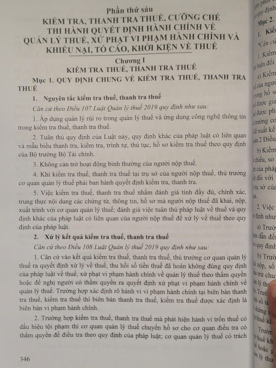 Phần thứ sáu. KIỂM TRA, THANH TRA THUẾ, CƯỠNG CHẾ THI HÀNH QUYẾT ĐỊNH HÀNH CHÍNH VỀ QUẢN LÝ THUẾ, XỬ PHẠT VI PHẠM HÀNH CHÍNH VÀ KHIẾU NẠI, TỐ CÁO, KHỞI KIỆN VỀ THUẾ.