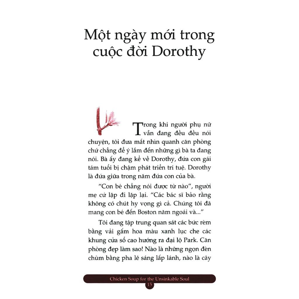 Công ty phát hành: First News - Trí Việt Tác giả: Nhiều tác giả Nhà xuất bản: NXB Tổng Hợp Năm xuất bản: 2023 Số trang: 192 Giá Bìa: 76.000 VND Kích thước: 13 x 20,5 cm Loại Bìa: Bìa mềm Mô tả sản phẩm: DÀNH CHO NHỮNG TÂM HỒN KHÔNG BAO GIỜ GỤC NGÃ Chicken Soup for the Unsinkable Soul là một tuyển tập các mẩu truyện về những con người đã đối mặt thử thách với một niềm tin, sự hài hước và cả con tim. Tất cả chúng ta đều không ít lần gặp trở ngại trong cuộc sống. Có khi đó chỉ là những khó khăn nhỏ khiến ta vấp nhẹ trước khi ta có thể tự đứng vững trên đôi chân của mình, nhưng cũng có khi đó là những trở ngại lớn lao hệt như những áng mây mờ u ám. Cách giải quyết những tình huống đó sẽ có ảnh hưởng quyết định đến cuộc đời của chính chúng ta, rằng chúng ta sẽ sống trong nước mắt và giận dữ hay sẽ dễ dàng đón nhận cuộc sống này với tất cả niềm hân hoan. Chicken Soup for the Unsinkable Soul được biên soạn nhằm giúp mọi người có thể vượt qua những trở ngại của cuộc sống thường nhật. Nhân vật trong sách là những con người đang phải đối mặt với những mất mát tình cảm không gì bù đắp được, đang chống trả với bệnh tật, đang trải qua những thăng trầm trong cuộc sống, đang theo đuổi những giấc mơ hoặc chỉ đơn giản là đang muốn tự hoàn thiện mình. Từ những mẩu chuyện hài hước đến những mẩu chuyện về lòng quả cảm, từ những hoàn cảnh có vẻ rất khó tin đến những tình huống rất đời thường, mỗi câu chuyện đều làm nổi bật khả năng chế ngự hoàn cảnh của từng nhân vật. Ví dụ, bạn có thể cùng chia sẻ thành quả với một tay leo núi cừ khôi - mặc dù bị mù cả hai mắt nhưng vẫn chinh phục được một trong những ngọn núi nguy hiểm nhất thế giới, một phụ nữ trung niên đã dám thử sức mình ở một công việc hoàn toàn mới mẻ và cuối cùng cũng đã trở thành người phụ trách chuyên mục trong một tờ báo, một cô gái bị tật nói lắp đã có thể tự tin cất cao tiếng nói tại một buổi sinh hoạt tập thể ở trường, một người mẹ trẻ đột ngột bị liệt toàn thân nhưng vẫn quyết vượt qua nghịch cảnh thay vì cứ mãi than vãn cho bản thân… Đọc từng trang sách, bạn sẽ vô cùng kinh ngạc về cách mà những con người ấy đã mạo hiểm và luôn giữ vững lòng tin trong mọi tình huống, ngay cả khi nhiều người khác vẫn bảo với họ rằng: “Điều đó không thể thực hiện được!” Cuốn sách này cũng sẽ giúp bạn làm thế nào để “nhìn cuộc sống bằng đôi mắt cười”, làm thế nào để xem những trở ngại là một bậc thang giúp ta tiến đến những điều tuyệt vời khác và làm thế nào để biết trân trọng những thứ mình đang có. Tiếp đến, Chicken Soup for the Unsinkable Soul cũng sẽ giúp bạn nhận ra giá trị đích thực của những tấm lòng biết sẻ chia. Chúng tôi hy vọng những mẩu chuyện nhỏ ấy sẽ khuyến khích bạn tìm đến mọi người khi bạn cần được giúp đỡ cũng như giúp bạn sẽ mở rộng trái tim mình với những ai đang cần tựa đầu vào bờ vai bạn. Và cuối cùng, có rất nhiều mẩu chuyện sẽ chứng minh cho chúng ta thấy rằng trở ngại cũng chính là người thầy tốt nhất của mỗi người. Chúng có thể khơi dậy sức mạnh tiềm tàng của ta, nhắc chúng ta nhớ về những khía cạnh cần hoàn thiện, chỉ dẫn chúng ta cách giữ vững lòng tin vào chính mình và hướng dẫn ta cách chấp nhận những việc không thuộc phạm vi kiểm soát của bản thân. Xin dành tặng cuốn sách này cho tất cả các bạn. Chúng tôi hy vọng rằng bạn sẽ xem món quà này như một lời nhắc nhở, giúp bạn luôn nhớ rằng bạn hoàn toàn có khả năng để thực hiện những giấc mơ của mình.