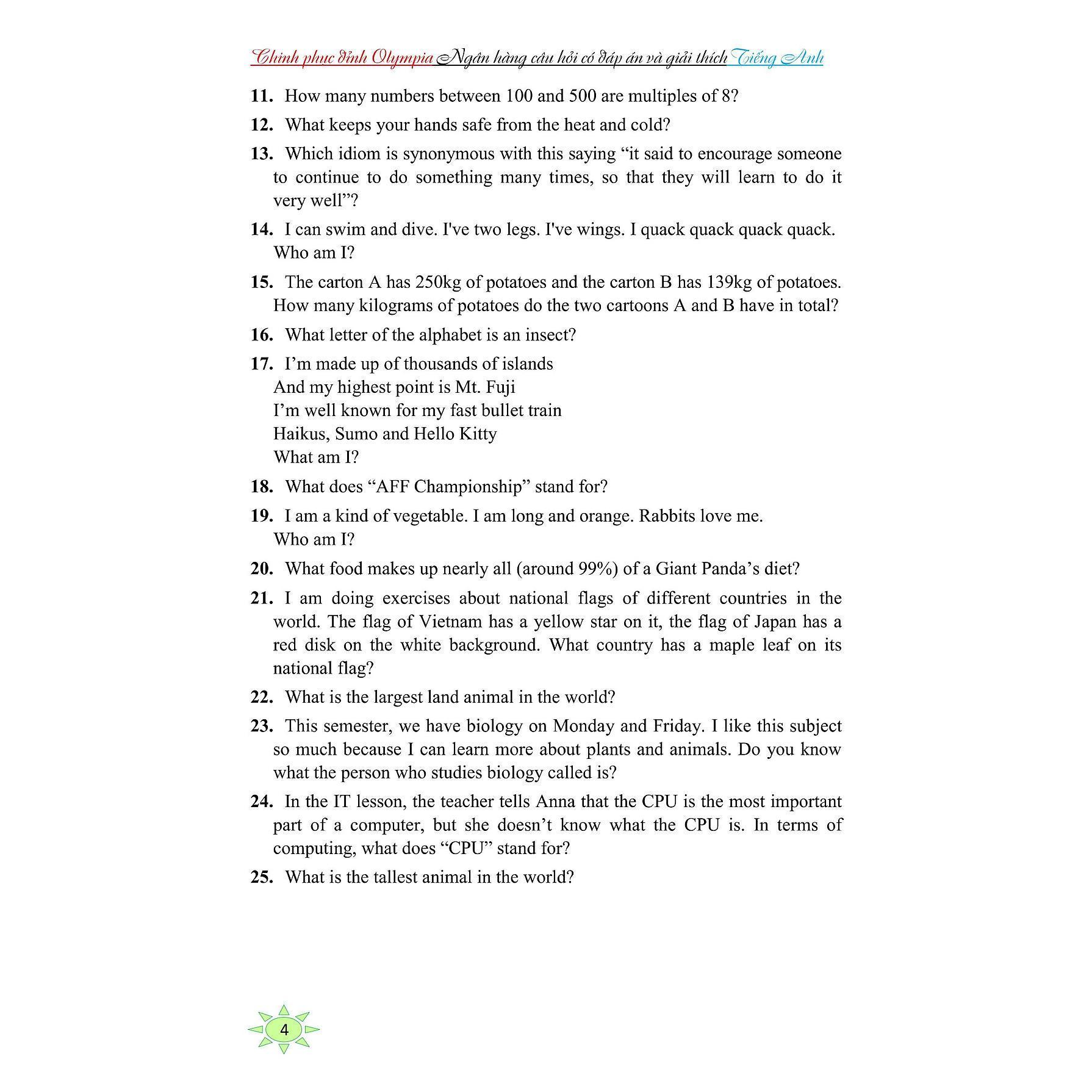 Vai trò của Tiếng Anh trong các kì thi là hết sức quan trọng, Đường Lên Đỉnh Olympia là một cuộc thi kiến thức trên truyền hình dành cho học sinh Trung học phổ thông. Trải qua hơn 20 năm, các vòng thi trong cuộc thi này ngày càng đổi mới và toàn diện với hệ thống các câu hỏi đa lình vực. Trong đó không thể thiếu các câu hỏi tiếng Anh được đưa ra bởi các chuyên gia trong và ngoài nước. Với mong muốn giúp các em học sinh hiểu và nắm bắt được cấu trúc của các vòng thi trong sân chơi tri thức này, cuốn "Chinh Phục Đỉnh Olympia Ngân Hàng Câu Hỏi Có Đáp Án Và Giải Thích Tiếng Anh" được biên soạn. Cuốn sách này sẽ giúp các em học sinh từ bậc Tiểu học tới Trung học phổ thông trau dồi và rèn luyện kiến thức. Nội dung cuốn sách gồm 4 phần, mỗi phần đều có 4 vòng: Vòng 1: Khởi động Vòng 2: Vượt chướng ngại vật Vòng 3: Tăng tốc Vòng 4: Về đích