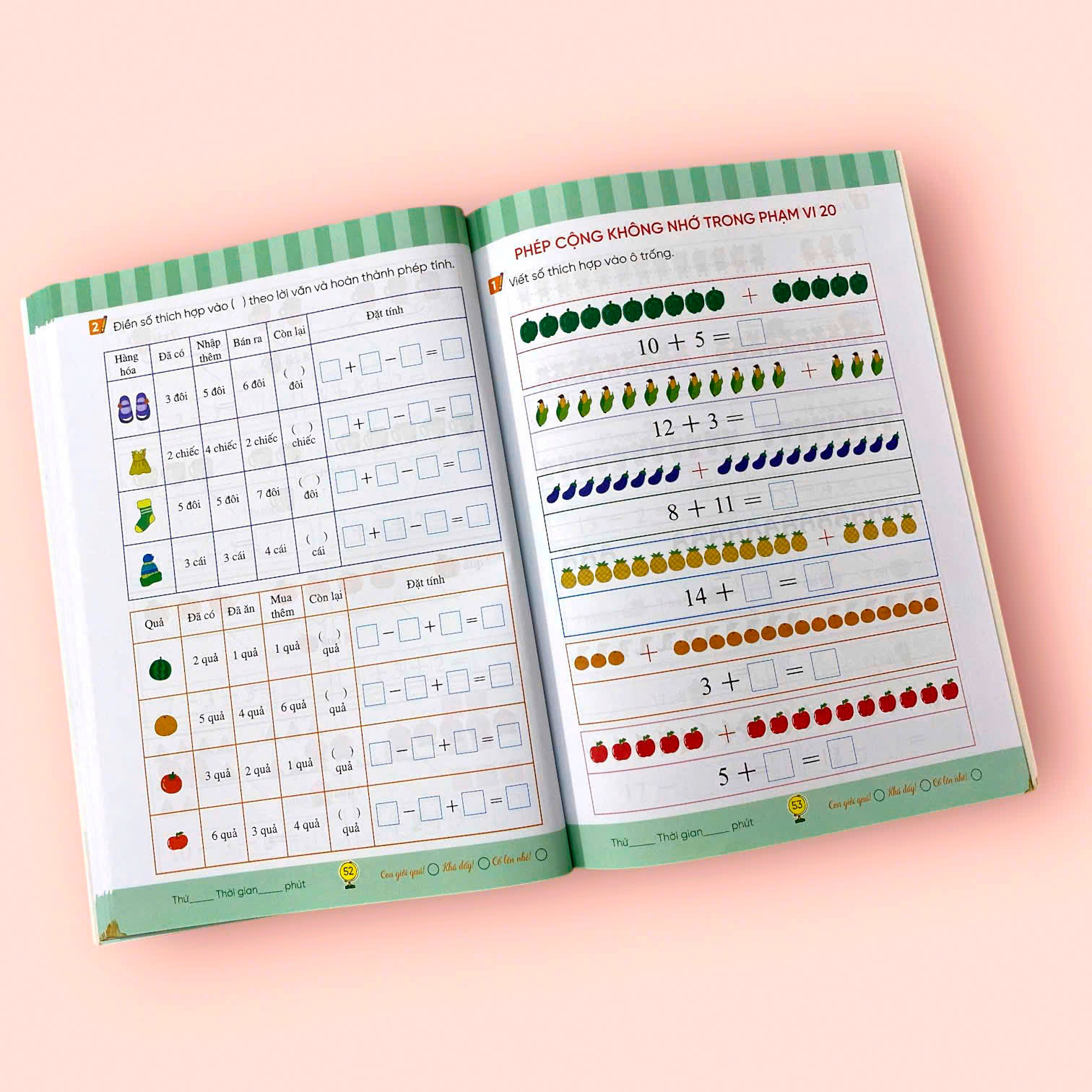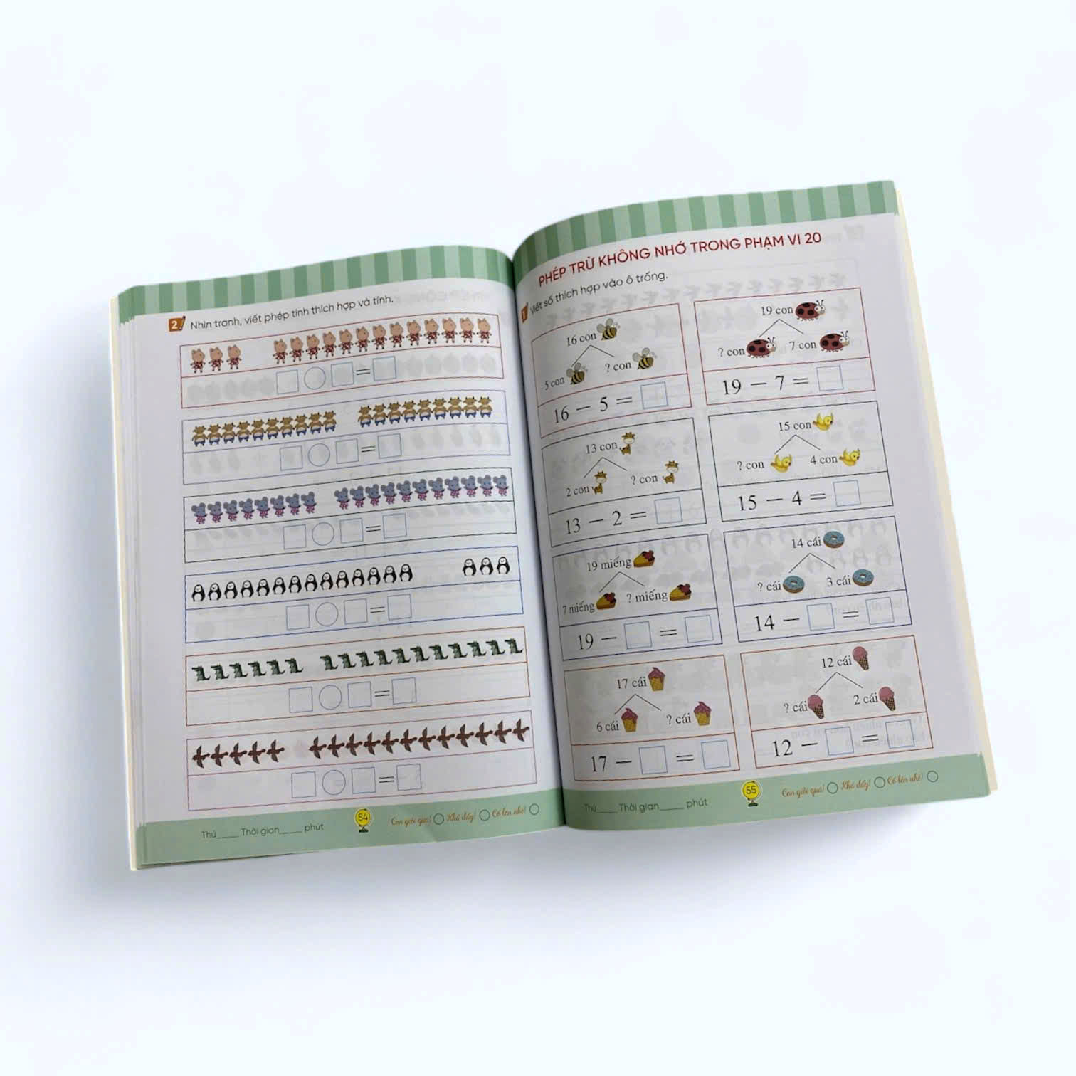 Nội dung và hình ảnh được thiết kế phù hợp với trẻ tiền tiểu học, giúp bé dễ dàng nắm bắt và hứng thú với môn toán.