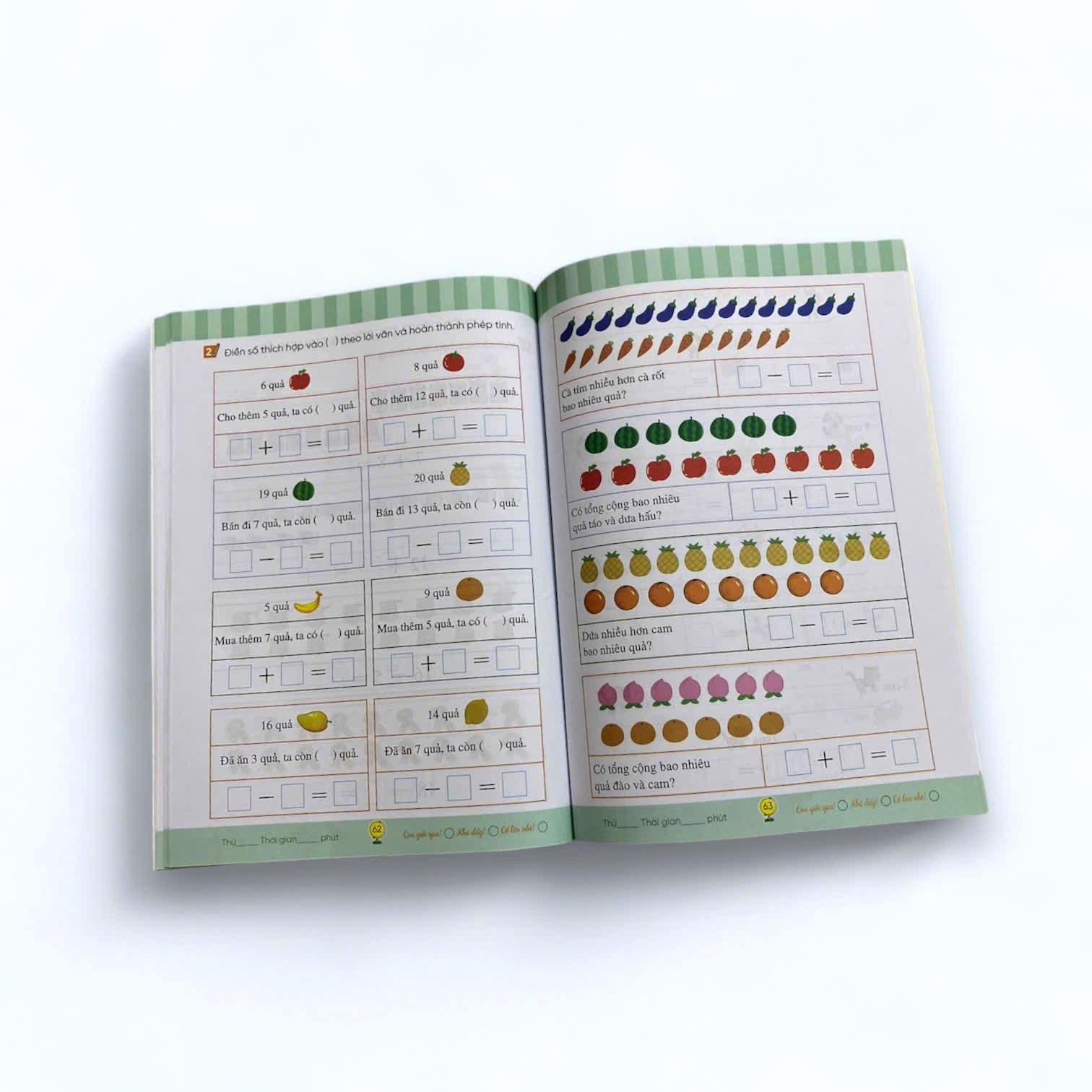- Các bài toán được minh họa bằng hình ảnh sinh động, giúp bé dễ dàng tiếp thu và ghi nhớ các khái niệm toán học.