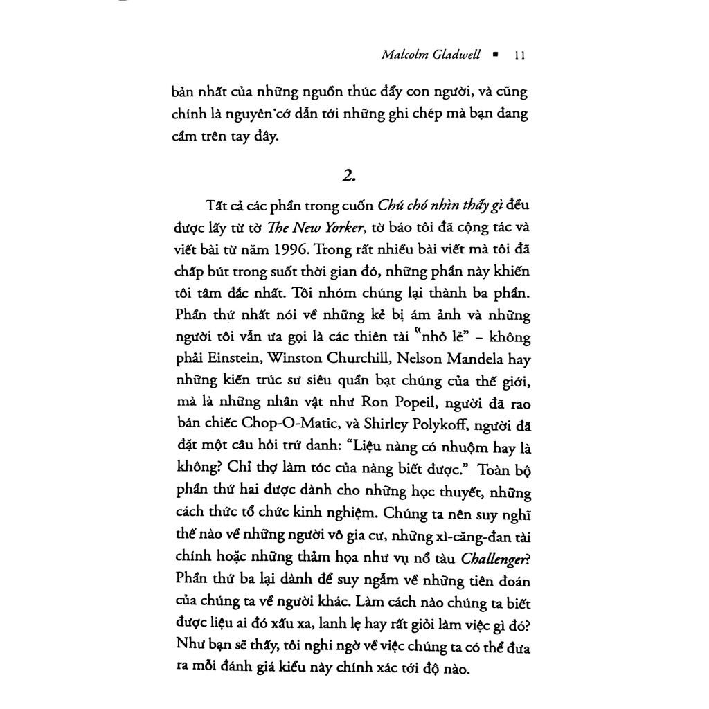 Mua tại TiktokGIỚI THIỆU SÁCH : Chú Chó Nhìn Thấy Gì? (Tái Bản ) Có cấu trúc và giọng văn cân nhắc chỉn chu, song bạn sẽ thấy 19 bài viết trong cuốn sách này đề cập đến những khía cạnh hoàn toàn khác nhau của cuộc sống từ việc: "Mù tạt giờ đây xuất hiện với cả tá chủng loại. Vì đây ketchup vẫn nguyên xi y dạng?" "Những điều về sức khỏe phụ nữ mà cha đẻ của thuốc ngừa thai không hề biết" "Cuộc sống của một người có đáng bị hủy hoại chỉ vì lời buộc tội đạo văn?"... Mỗi bài viết điều có khả năng thu hút bạn, khiến bạn phải ngẫm nghĩ, hay đem lại cho bạn ý niệm lờ mờ nào đó về trí não của kẻ khác". Hãy đọc và cùng khám phá những cuộc phiêu lưu của Gladwell để hiểu rõ hơn những hiện tượng xung quanh bạn, qua đó bồi đắp thêm kinh nghiệm sống cho bản thân. Cuốn sách chia làm ba phần: Phần thứ nhất: Những kẻ ám ảnh, những người tiên phong và những kiểu thiên tài nhỏ lẻ khác Phần thứ hai: Những luận thuyết, tiên lường và chuẩn đoán Phần thứ ba: Nhân phẩm, tính cách và trí tuệ