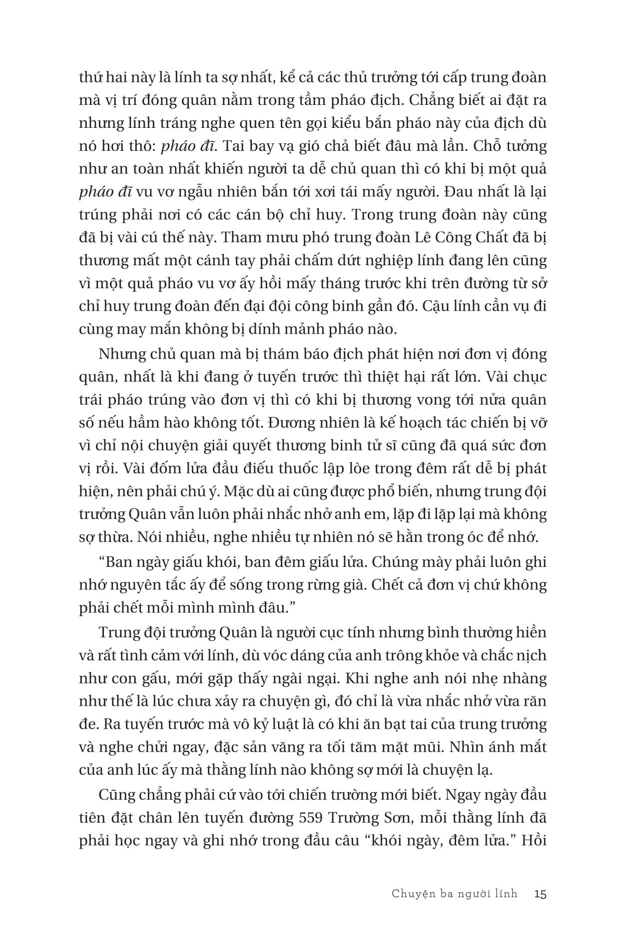 Chuyện Ba Người Lính Giống như nhiều tiểu thuyết hoặc phim chiến tranh, Chuyện ba người lính được kể lại bám theo cuộc đời quân ngũ của một tân binh từ ngày nhập ngũ cho đến hết chiến tranh....