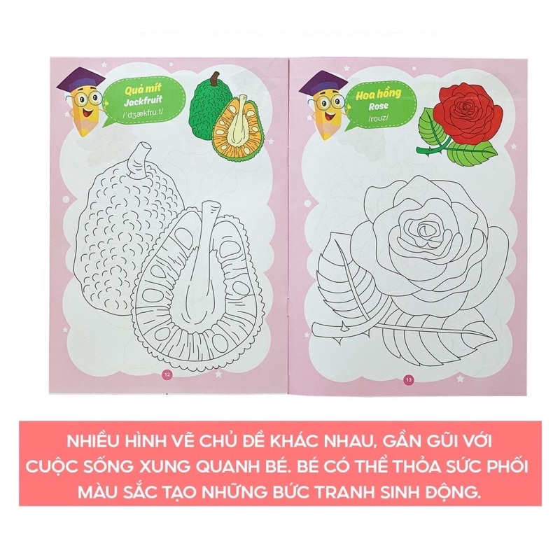 Bộ tô màu 4-5 tuổi giúp bé học thêm các từ vựng với nhiều chủ đề theo tiếng việt và tiếng anh. Bé mở rộng vốn từ vựng, phát triển ngôn ngữ