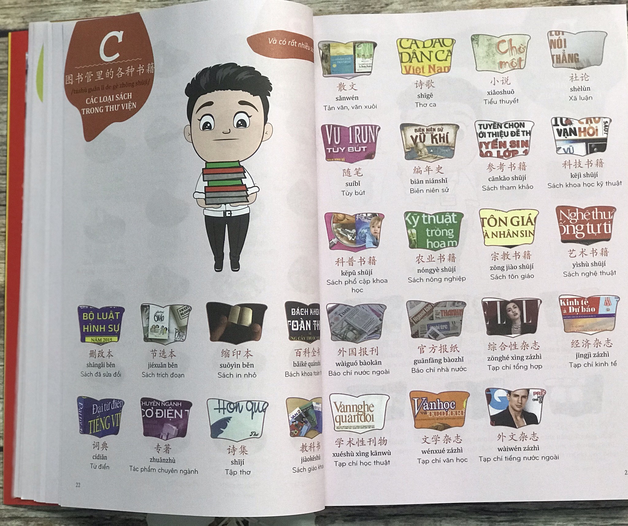 4. Cuối cùng các hành động ở trên tạo ra kết quả ra sao, bạn và mọi người cảm thấy thế nà Là chúng ta sẽ có nhau nhóm TÍNH TỪ Thật tuyệt vời, từ 3 nhóm từ trên là chúng ta đã có ngay đầy đủ 3 nhóm từ chính và nhanh tay ghép vào các cấu trúc ngữ pháp để tạo thành câu hoàn chỉnh. Với mỗi chủ đề bạn sẽ lần lượt liệt kê ra các DANH TỪ, các ĐỘNG TỪ, các TÍNH TỪ liên quan được miêu tả sinh động và cực kỳ chi tiết qua hình ảnh chân thực. Tiếp đó sẽ có phát triển học thêm các PHÓ TỪ và TRẠNG TỪ qua các đoạn hội thoại mẫu mang tính ứng dụng cực kỳ cao giúp bạn sau này dễ dàng hơn rất nhiều trong việc học ngữ pháp đó nha. Cuốn sách này gồm 20 chủ đề thông dụng nhất trong đời sống với tổng cộng gần 5000 từ vựng khác nhau được miêu tả chi tiết qua hình ảnh và lồng ghép trong hội thoại. Các chủ đề bao gồm: Trường hoc, thư viện, nhà bếp, công viên, quán ăn, khách sạn, chợ và siêu thị, công ty, bệnh viện, nhà ga và bến xe, sân bay, quán cafe, phòng tắm và nhà vệ sinh, tiệm mát xa, cửa hàng điện thoại, rạp chiếu phim, nhà thi đấu thể thao, cửa hàng mỹ phẩm, cửa hàng thời trang. Ngoài từ vựng sách còn đưa thêm rất nhiều ví dụ giao tiếp và cấu trúc liên quan trực tiếp đến từng chủ đề để bạn dễ dàng bổ sung kiến thức liên quan trong quá trình tự học mà không cần phải tra các sách từ điển ngữ pháp khô khan!