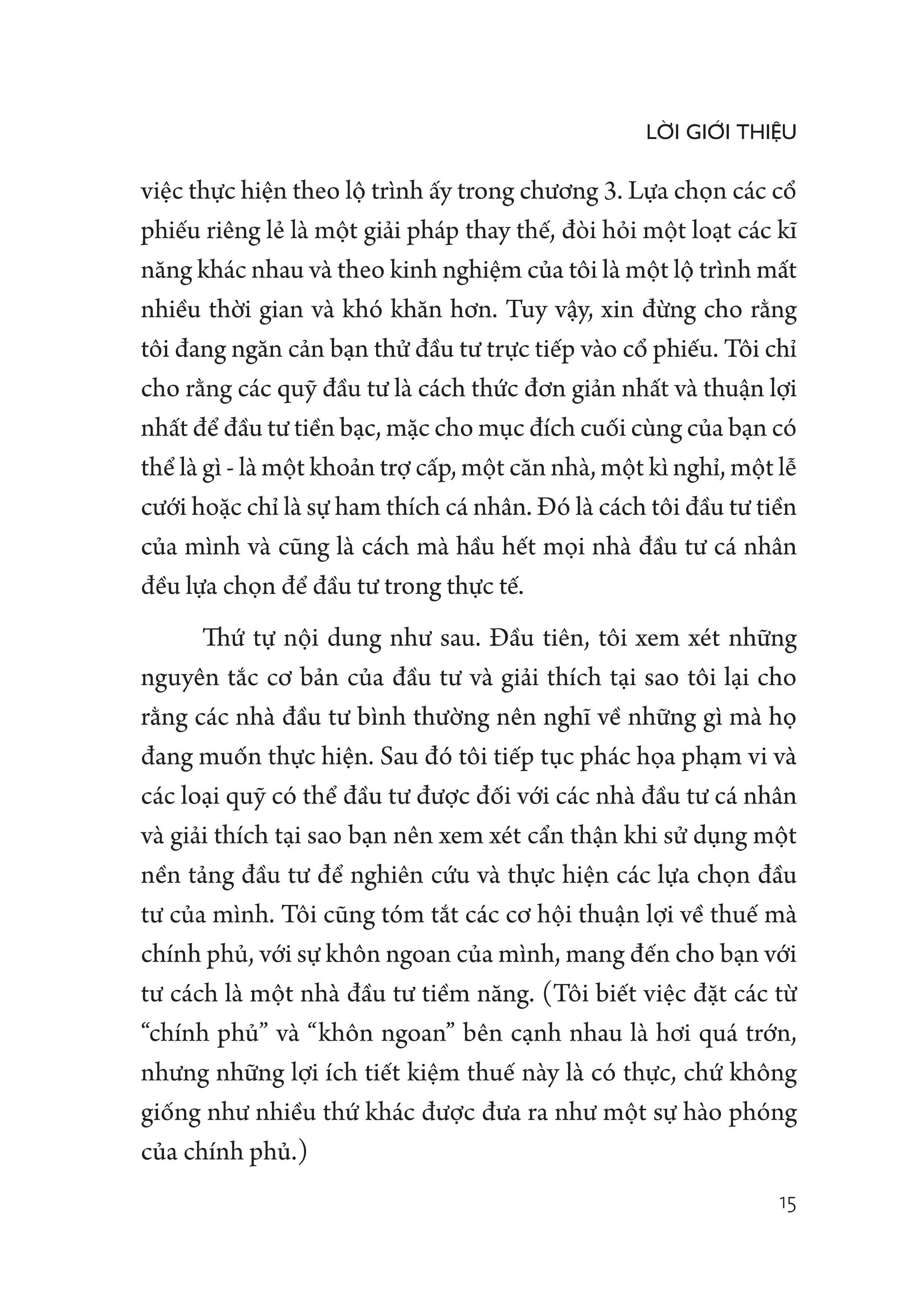 Cuốn sách sẽ mô tả một số bước cơ bản giúp bạn chọn được các quỹ đầu tư tốt nhất và kết hợp chúng với nhau để tạo nên một danh mục đầu tư được cân đối hợp lí. Những gì cần có trong các danh mục đầu tư của người mới bắt đầu đã được tóm tắt và thiết kế cho bạn để giúp bạn khởi sự, tùy thuộc vào khả năng chấp nhận rủi ro của bạn.