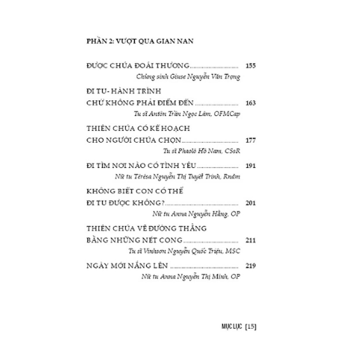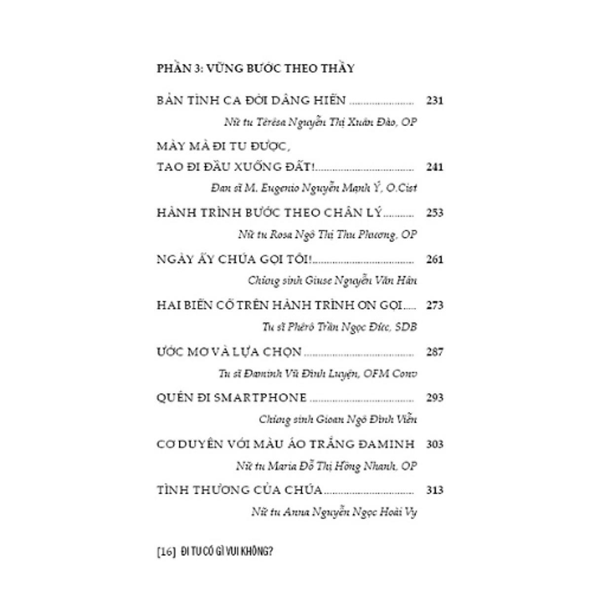 Người đi tu thường được mọi người quan tâm đặt những câu hỏi chẳng hạn như: “Tại sao cha (thầy, sơ) lại đi tu?” hoặc “Làm sao để biết được mình có ơn gọi đi tu?” Cũng có rất nhiều bạn trẻ đang phân vân lưỡng lự trước lời mời gọi bước vào đời sống tu trì, tận hiến cho Chúa và phục vụ tha nhân. Và ngay cả khi đã can đảm dấn thân, nói lời “xin vâng,” họ vẫn sẽ phải đối diện với rất nhiều khó khăn trên những bước chân chập chững đầu tiên của hành trình theo đuổi ơn gọi. Không phải ai cũng vượt qua được những giai đoạn sơ khởi này! Vì thế, nếu có ai đó chia sẻ cho họ nghe những kinh nghiệm làm sao nhận ra tiếng Chúa gọi và bền đỗ trong đời tu thì sẽ thật tốt biết bao.