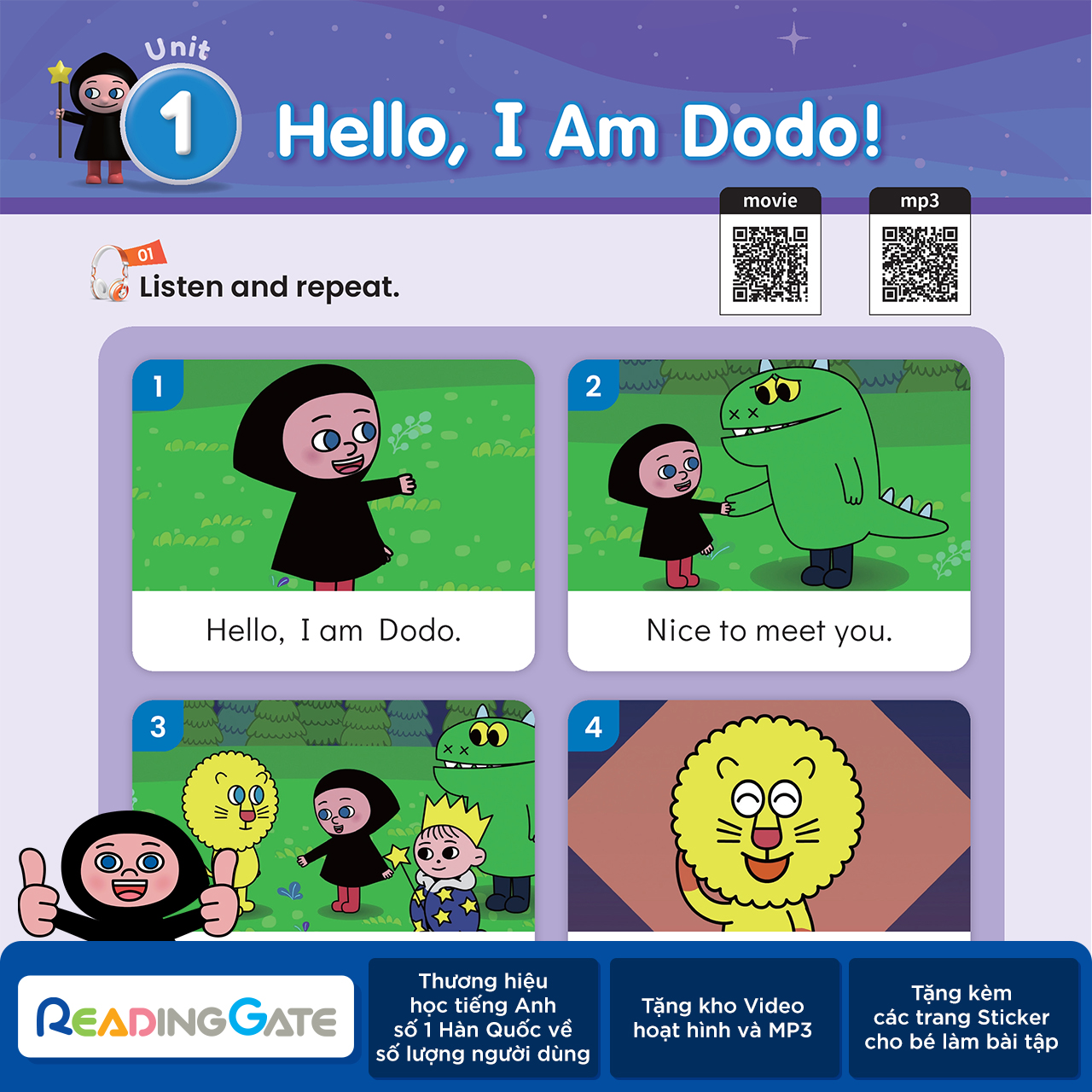 - Mỗi bài học (Unit) trong Workbook đều đi kèm Barcode cho phép truy cập trực tiếp vào kho Video và Mp3 của DODO ABC mà không cần phải có tài khoản trả phí của Reading Gate.