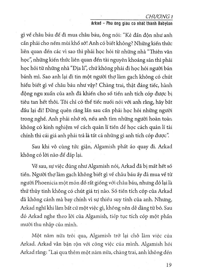 Arkad vốn chỉ làm công việc khắc chữ cho quan phủ để mưu sinh, bản thân ông cũng không có nhiều thời gian để đầu tư cho việc nghiên cứu quản lý tài chính. Thế nhưng, từ kinh nghiệm của bản thân và theo dõi phương pháp của người khác, Arkad đã bắt đầu học được cách chi tiêu hợp lý. Từ việc quản lý chi tiêu, ông dần nhận ra rằng nếu muốn có một cuộc sống sung túc, giàu có cho sau này thì cần phải biết tích lũy tài sản. Dần dần, ông tìm ra được phương pháp giúp quản lý tiền bạc hợp lý, giúp từng món tiền nhỏ mà ông kiếm được đều góp phần gia tăng số tài sản mà Arkad sở hữu.