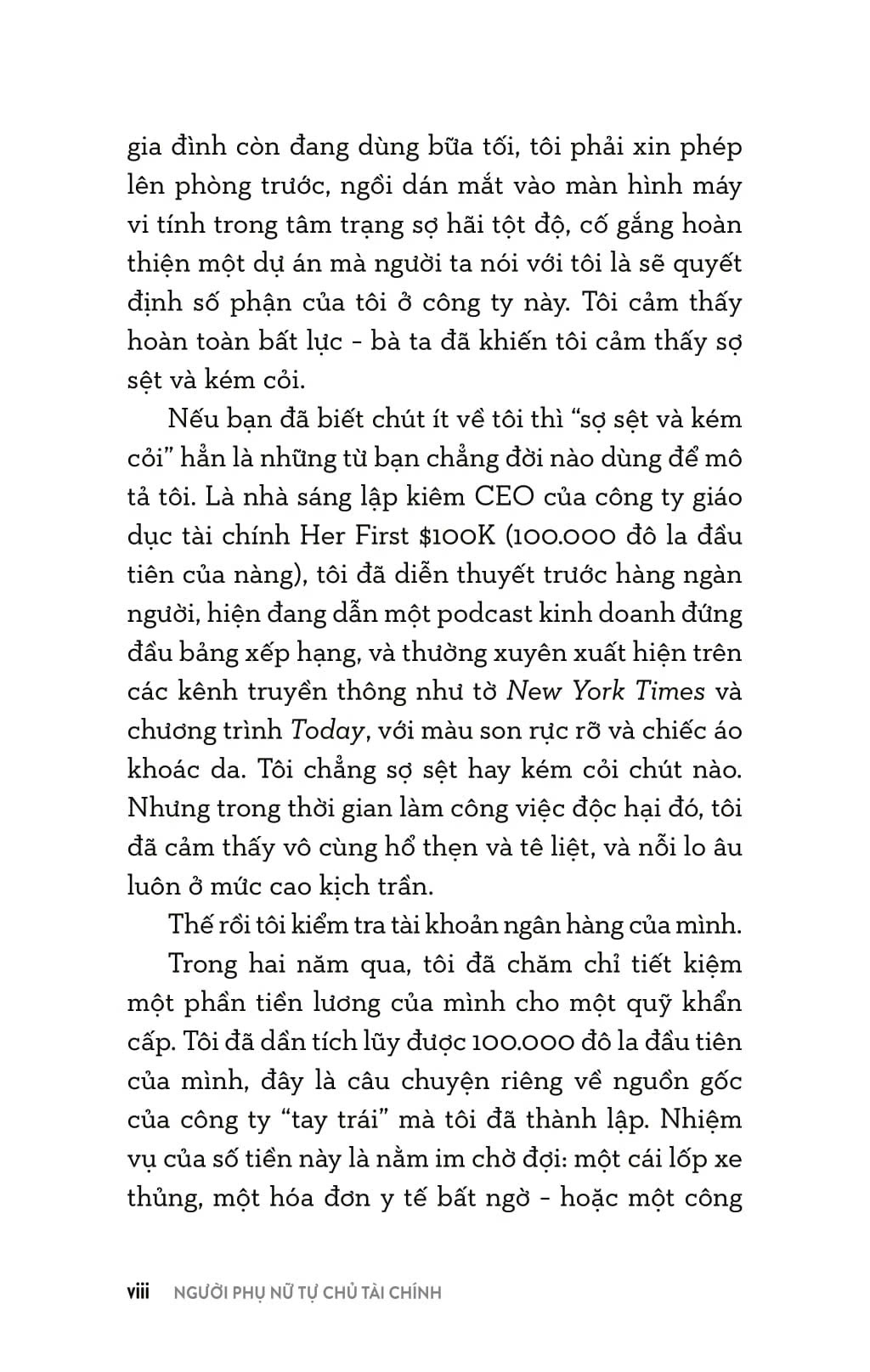 Từ nhỏ, Tori đã được học cách quản lý tiền bạc, nhưng cô sớm nhận ra phụ nữ thường ít được giáo dục toàn diện về tài chính. Các bé gái được dạy cách chi tiêu tiết kiệm, trong khi các bé trai được học về đầu tư và khuyến khích làm giàu. Khi trưởng thành, phụ nữ lại bị bủa vây bởi định kiến rằng họ tiêu xài hoang phí, và những khoản chi tiêu nhỏ cho bản thân đang khiến họ nghèo đi. Khi những sự kiện lớn, như một đại dịch toàn cầu, xảy ra, phụ nữ dễ mất việc và khó kiếm lại công việc hơn đàn ông. Vậy nên, thật dễ hiểu tại sao tiền bạc lại là nỗi lo lắng thường trực của rất nhiều phụ nữ.