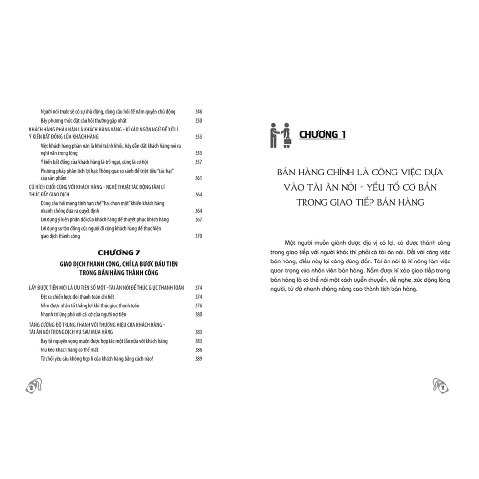 Giao Tiếp Chuyên Nghiệp Để Bán Hàng Thành Công Sản phẩm là sinh mạng thì bán hàng chính là linh hồn của nó. Để sản phẩm của bạn trở nên nổi bật và có đủ khả năng cạnh tranh trong thị trường hiện nay thì bạn cần phải khiến sản phẩm đó trở nên sinh động và cuốn hút với công chúng. Nói cách khác, bạn cần phải sử dụng nghệ thuật ngôn từ của bản thân để thuyết phục khách hàng lựa chọn sản phẩm của mình. Tài ăn nói - tổ chất mà bất kỳ nhân viên bán hàng nào cũng cần có Khả năng giao tiếp là yếu tố quan trọng nhất với mọi nhân viên bán hàng. Vì vậy, nếu bạn không có đủ sự tự tin, bình tĩnh và thoải mái khi giao tiếp với khách hàng, bạn sẽ không bao giờ có thể thành công trong công việc này. Tuy nhiên, ở chiều ngược lại, nếu bạn cứ liên tục tìm cách tiếp cận và thao thao bất tuyệt giới thiệu về sản phẩm thì cái bạn nhận được không phải gia tăng doanh số mà là sự khó chịu đến từ những vị khách hàng. Nghệ thuật giao tiếp trong “Giao tiếp chuyên nghiệp để bán hàng thành công" Nội dung cuốn sách được chia làm bảy chương, giải đáp tỉ mì từng giai đoạn trong quá trình bán hàng bao gồm: yếu tố cơ bản trong giao tiếp bán hàng, tài ăn nói để khai thác khách hàng hữu hiệu, kỹ xảo nói chuyện qua điện thoại, kĩ xảo thực chiến khi tiếp cận khách hàng, bồi dưỡng phẩm chất đạo đức bản thân, phương pháp khiến khách hàng nhanh chóng đồng thuận tiến hành giao dịch và các vấn đề phía sau mỗi đơn hàng… Những nội dung được giải đáp trong cuốn sách sẽ hỗ trợ bạn trong quá trình rèn luyện tài ăn nói xuất sắc. Chỉ như vậy, bạn mới có đủ sự tinh tế, nhạy bén để phát hiện, khai thác thậm chí là sáng tạo ra những nhu cầu của khách hàng, nhờ vậy, bạn có thể lựa lời đề cập đến những vấn đề mà khách hàng muốn nghe, thông tin họ muốn tìm hiểu, khiến họ trở nên hứng thú với sản phẩm và đơn hàng giao dịch cũng sẽ thuận lợi đến tay. Thêm vào đó, cuốn sách lựa chọn hướng tiếp cận khá thoải mái và có đôi phần hài hước. Do đó, bạn sẽ có cảm giác thoải mái, không bị quá nặng nề triết lý nhưng vẫn đảm bảo lượng kiến thức quan trọng mà bạn mong muốn. Phương pháp phân tích - lý giải tình huống trong cuốn sách Một trong những lý do khiến bạn có thể dễ dàng nắm rõ và áp dụng những kỹ năng được đề cập ở cuốn sách“Giao tiếp chuyên nghiệp để bán hàng thành công” nằm ở phương pháp phân tích và lý giải vấn đề của tác giả. Từ chủ đề chung nhất về một giai đoạn cụ thể trong bán hàng, cuốn sách sẽ đưa ra các tình huống ví dụ rất thực tế trong việc trò chuyện với người mua hàng. Tiếp đó, nội dung đi sâu phân tích lý do khiến cho cách xử lý của người nhân viên thành công hoặc thất bại. Sau cùng là phần kết luận ngắn gọn, giúp bạn dễ dàng ghi nhớ các tip đã được đề cập và hướng dẫn cụ thể trong từng chương, từng phần. Nếu bạn đang muốn thay đổi bản