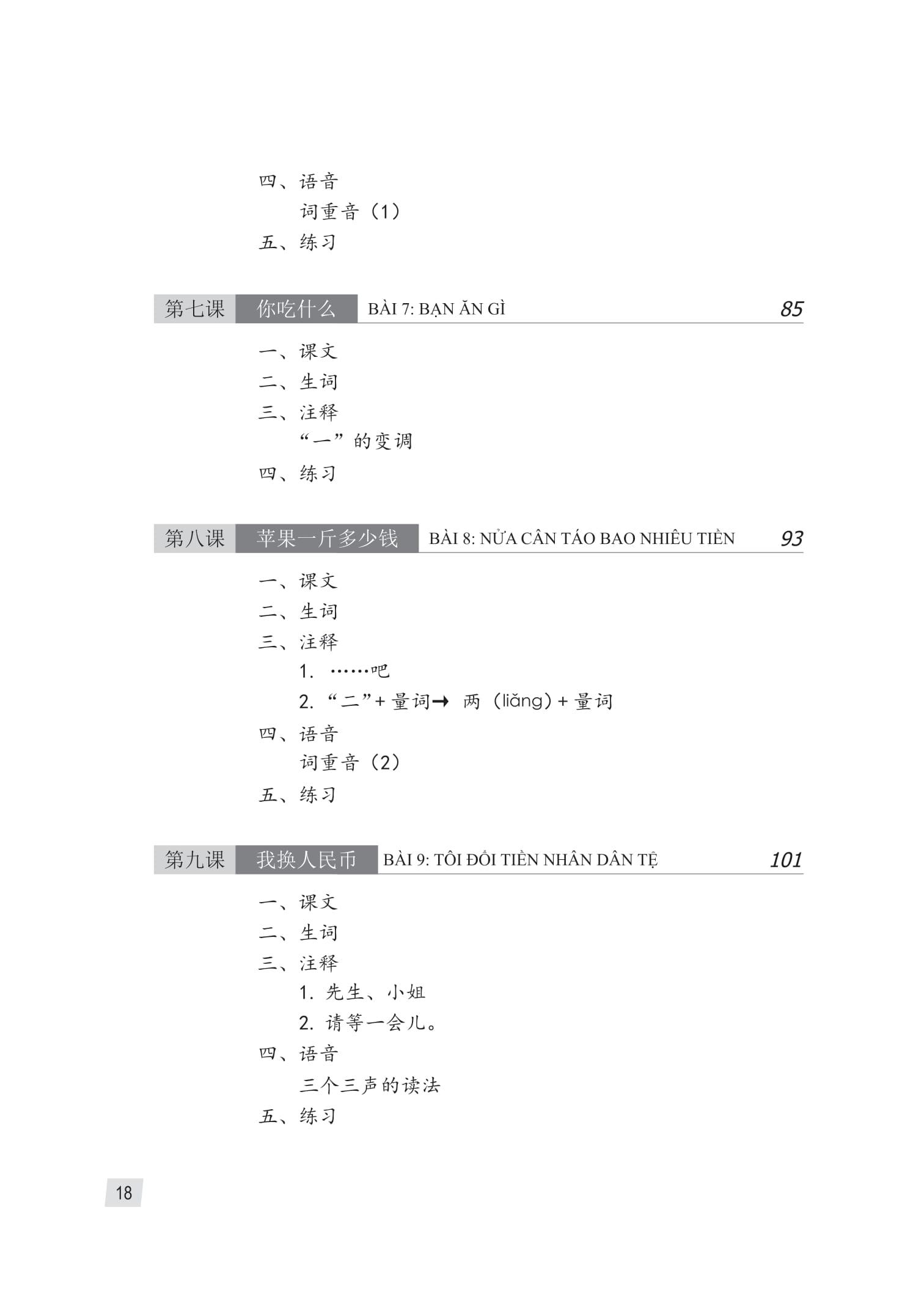 - Chú thích Phần chú thích trong giai đoạn ngữ âm chủ yếu giới thiệu kiến thức cơ bản về ngữ âm tiếng Hán. Còn ở giai đoạn ngữ pháp và mẫu câu, chủ yếu giới thiệu và giải thích một số kiến thức trọng điểm về ngôn ngữ và bối cảnh văn hóa Trung Quốc. Đối với những câu có điểm ngữ pháp xuất hiện trong bài khóa nhưng chưa được giải thích, hãy để sinh viên được hiểu nghĩa thông qua phần dịch nội dung chú thích.