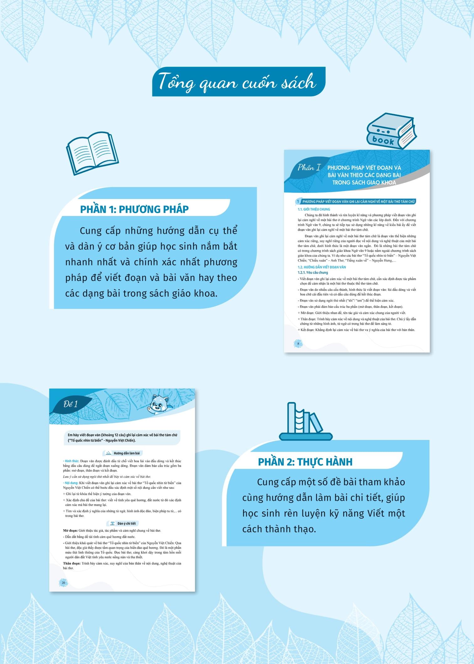 - Phương pháp viết đoạn và bài văn theo các dạng bài trong SGK: đưa ra những hướng dẫn tỉ mỉ, cụ thể cách viết đoạn văn ghi lại cảm xúc về một bài thơ 8 chữ và viết bài văn theo từng thể loại cụ thể (nghị luận xã hội, nghị luận văn học, thuyết minh, kịch).