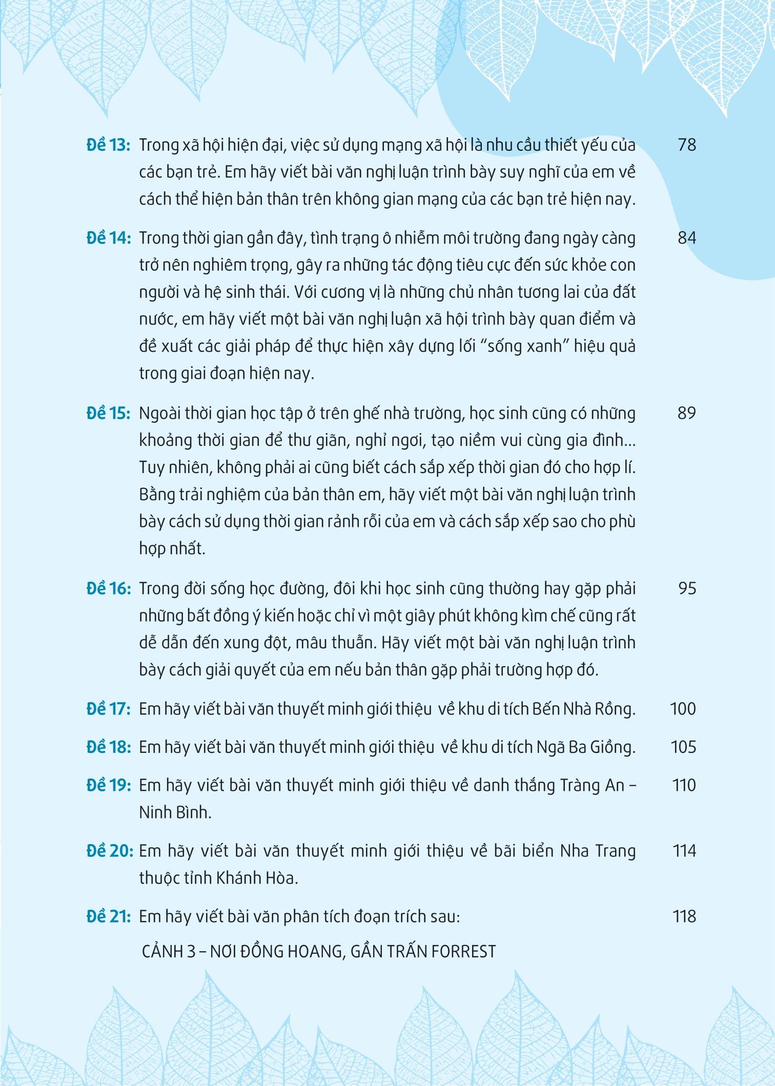 - Gồm 21 đề bám sát chương trình học: cấu trúc gồm hướng dẫn làm bài, gợi ý nhan đề, gợi ý dàn bài và bài văn mẫu tham khảo nhằm hướng dẫn học sinh luyện kĩ năng viết một cách thành thạo.