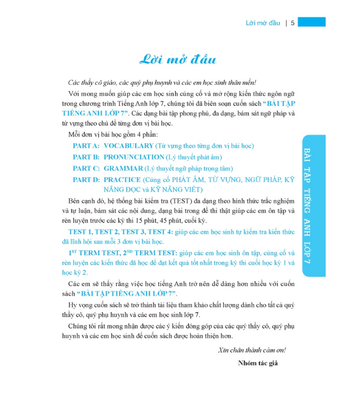 bài tập tiếng anh lớp 7 được biên soạn bám sát chương trình mới của Bộ Giáo dục & Đào tạo với các chủ điểm quen thuộc với học sinh lớp 7 như: MY NEW SCHOOL (Trường học mới của tôi); MY HOME (Gia đình tôi); MY FRIENDS (Các bạn tôi); MY NEIGHBOURHOOD (Hàng xóm của tôi); NATURAL WONDERS OF THE WORLD (Kỳ quan thiên nhiên thế giới); OURTETHOLIDAY (Ngày Tết của chúng tôi); TELEVISION (Truyền hình); SPORTS AND GAMES (Trò chơi và thể thao); CITIES OF THE WORLD (Các thành phố trên thế giới.